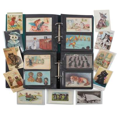 174 postcards, including a few duplicates, dated from the early 20th-century, many written, mostly showing cats but also including other animals, Christmas postcards, dress-up doll postcards, embossed postcards, and many others (quantity)