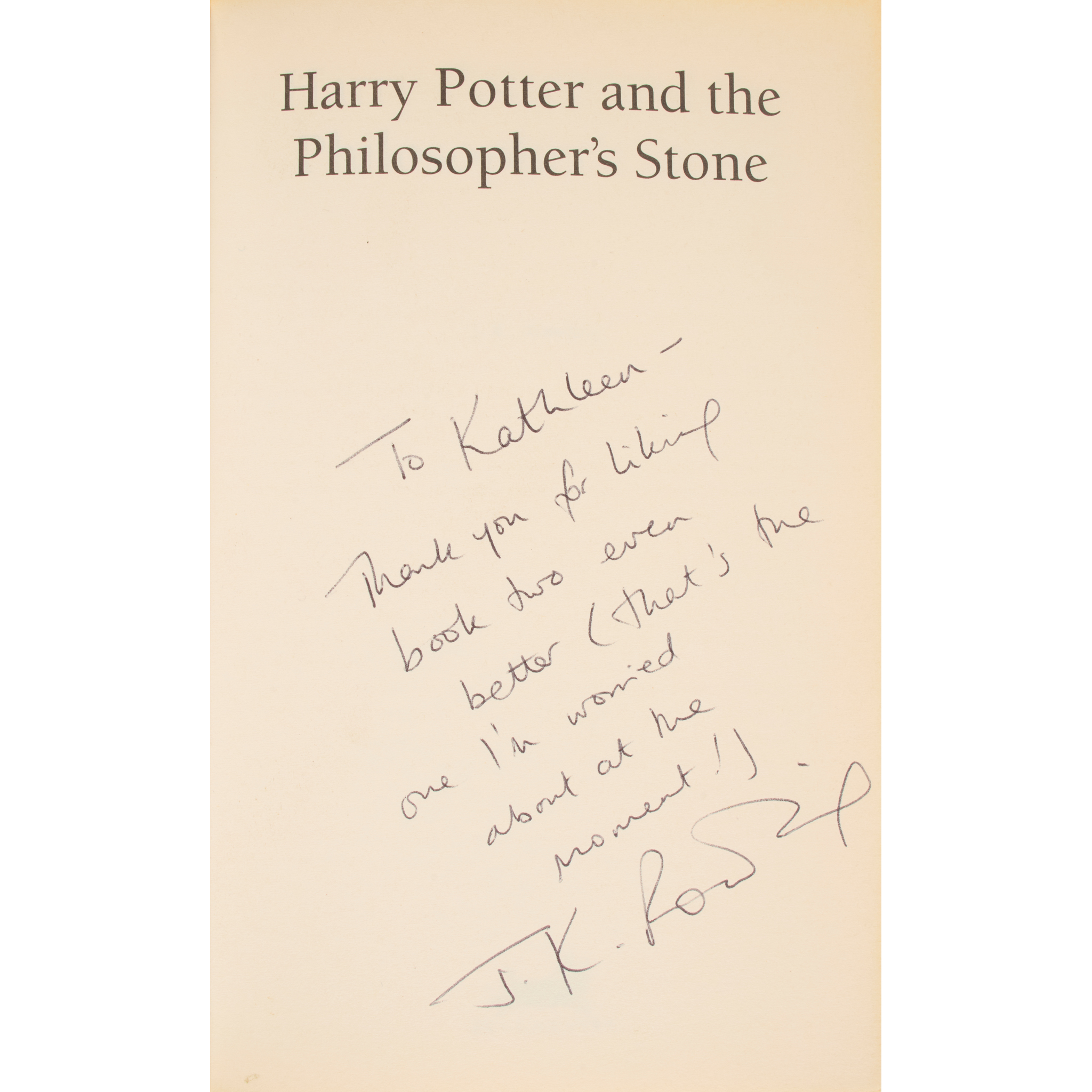 London: Bloomsbury, 1997. First edition, 13th impression paperback, signed and inscribed: “To Kathleen, Thank you for liking book two even better (that's the one I'm worried about at the moment!) J.K. Rowling", 8vo, original wrappers