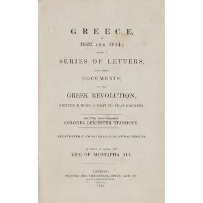 being a Series of Letters and other Documents on the Greek Revolution. London: Sherwood, Jones & Co., 1824. First edition, 8vo, hand-coloured frontispiece, 6 folding or double-page facsimiles, 19th century blue cloth