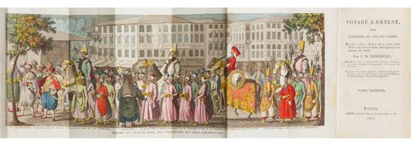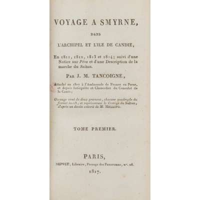 et l'Ile de Candie, en 1811, 1812, 1813 et 1814; suivi d'une notice sur Péra et d'une Description de la marche du Sultan. Paris: Nepveu, 1817. First edition, 2 volumes in one, 12mo, 2 folding hand-coloured engraved plates, half-titles, contemporary calf gilt, inscription on endpaper of G.C. Renouard 27th Apr. 1817, upper joint cracked