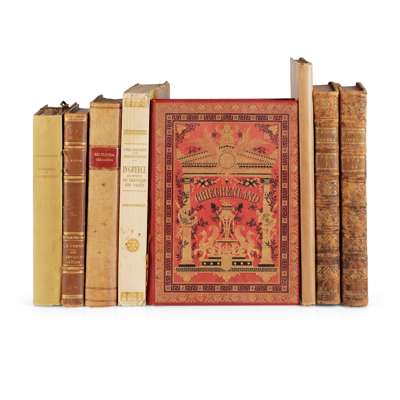 Marmorum Arundellianorum Seldenianorum, aliorumque, Academiae Oxoniensi donatorum. London: G. Bowyer, 1732. Second edition, 2 parts in one volume, folio, full-page engravings, contemporary calf, rebacked, corners repaired; Dionysius Areopagita Opera Comnia. Venice: A. Zatta, 1755-56. 2 volumes, folio, engraved frontispiece in volume 1, contemporary calf, slightly rubbed; Notor, G. La Femme dans l'antiquité Grecque. Paris, 1901. Folio, number 573 of 1100 copies, original wrappers bound in, calf gilt, rubbed; Balanos, Nicolas Les Monuments de l'Acropole. Paris, [n.d.], Folio, number 8 of 25 copies on Velin d'Arches, plates, loose in cloth-backed board folder, ties; Baud-Bovy, D. and Fred. Boissonnas In Greece, Journeys by Mountain and Valley. Geneva, 1920. Folio, one of 300 copies, plates, original wrappers, uncut, very slight wear at head and base of spine; Murray, A.S. and A.H. Smith White Athenian Vases in the British Museum. 1896, Folio, 27 plates, tissue guards, original quarter cloth, title lightly spotted; von Schweiger-Lerchenfeld, Freiherr, Amand Griencheland in Wort und Bild. Leipzig, 1882. Folio, plates, original pictorial red cloth gilt, g.e. (8)
