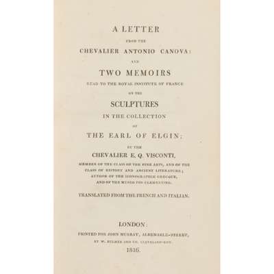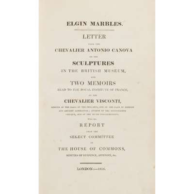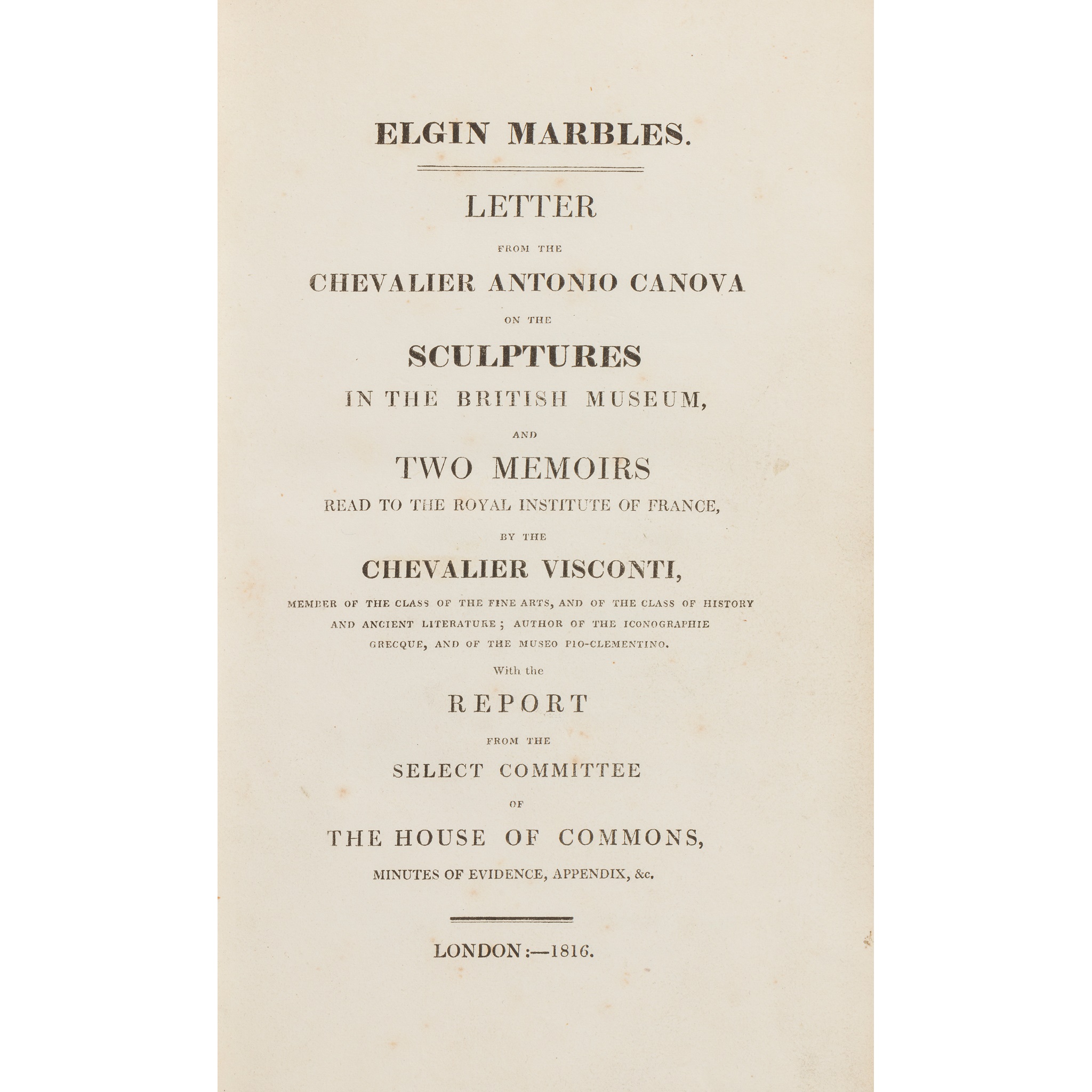 and Two Memoirs.. by the Chevalier Visconti... with the Report from the Select Committee of the House of Commons [on the Earl of Elgin's Collection of Sculptured Marbles], Minutes of Evidence, Appendix, &c. London, 1816. 2 parts in one volume, 8vo, contemporary calf, rebacked