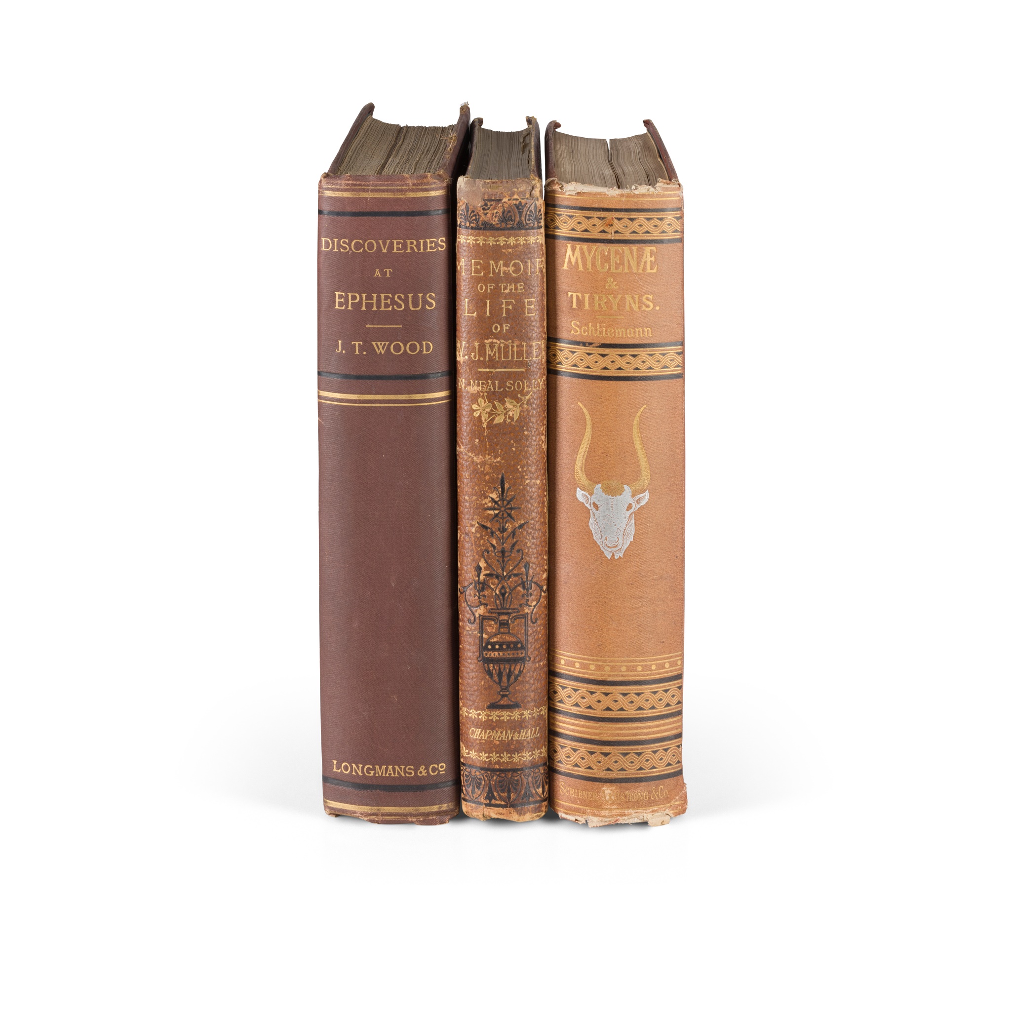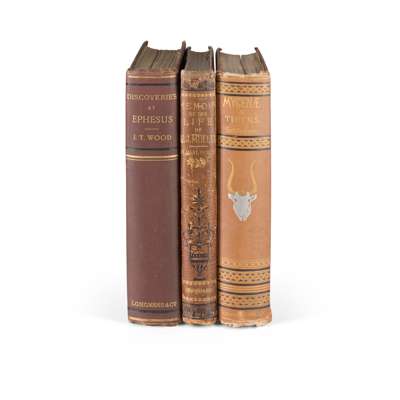 Discoveries at Ephesus. London, 1877. First edition, 8vo, 35 plates (4 coloured), original pictorial brown cloth gilt, a trifle rubbed; Schliemann, Henry Mycenae, a Narrative of Researches and Discoveries at Mycenae and Tiryns. New York, 1878. Large 8vo, 21 plates, 4 chromolithographs, 8 plans, several folding, original maroon pictorial cloth gilt, rubbed; Solly, N.N. Memoir of the Life of William James Müller, Landscape and Figure Painter... with an account of his travels. 1875. Large 8vo, mounted plates, original maroon cloth gilt, rubbed (3)