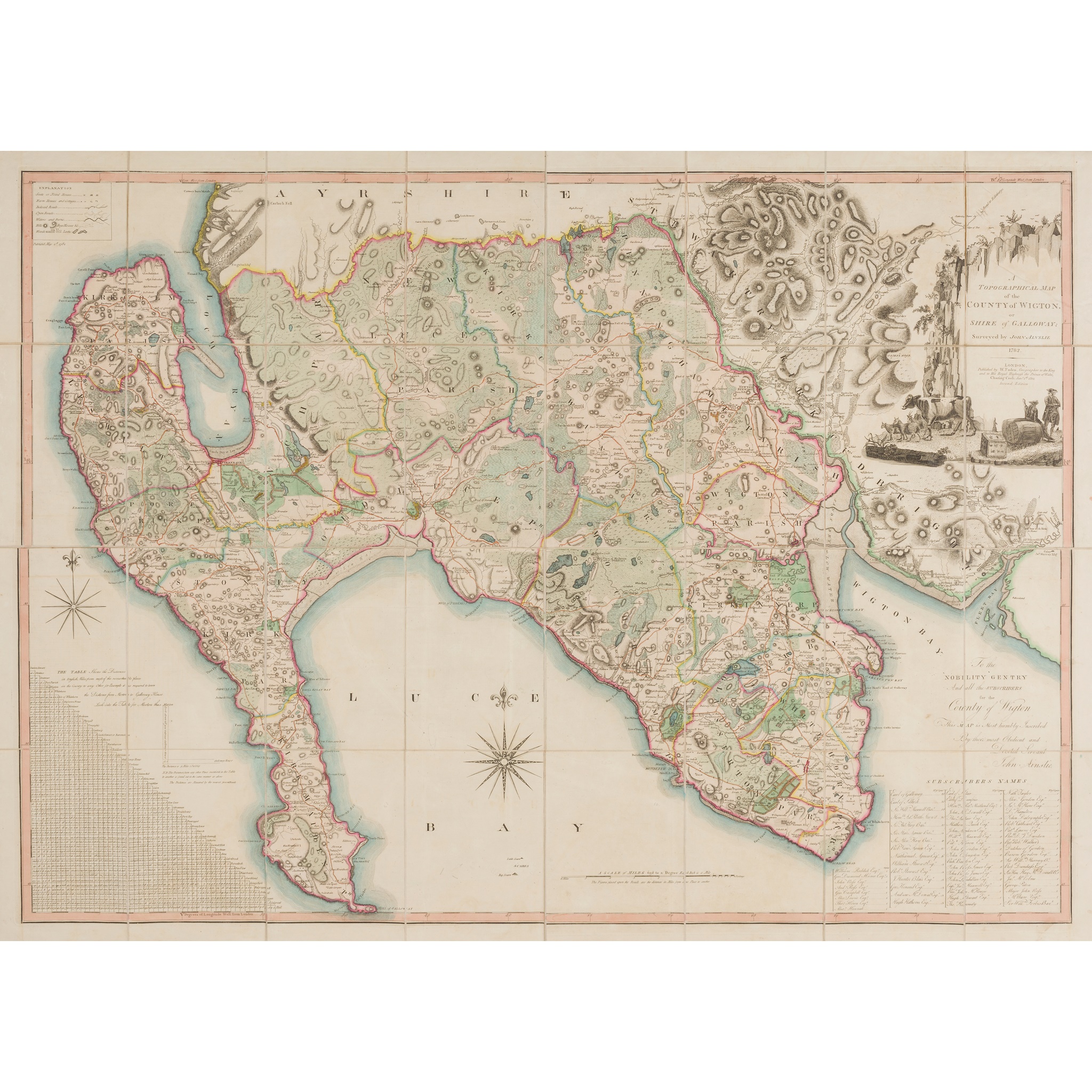 Note: John Ainslie (1745-1828) was born in Jedburgh in the Scottish Borders. In 1762 he was apprenticed to the London mapmaker and publisher Thomas Jefferys Sr., Geographer to King George III. It is here that he first learned the talents that made him the greatest British land-surveyor of his generation. As the Seven Years' War, and its American phase, drew to a close, Jefferys turned his attention away from military mapping to large-scale surveys of the English counties with Ainslie taking a leading role. At Jefferys' death in 1771 Ainsie returned to Scotland, establishing himself in business in Edinburgh as a land surveyor and publisher. He is best known for the sequence of large-scale Scottish county maps and his great map of Scotland.