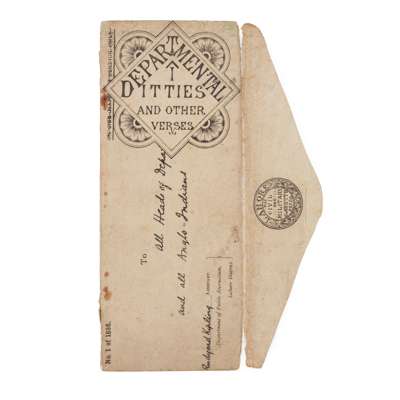 The highly idiosyncratic presentation of this volume is thus explained by its contents and the environment in which it was conceived and consumed. The verses are concealed in printed 'envelope' wrappers, addressed to 'all Heads of Depa.... and all Anglo-Indians', from 'Rudyard Kipling ASSISTANT. DEPARTMENT OF PUBLIC INFORMATION. LAHORE DISTRICT'. Thus, Departmental Ditties is humorously bound as a pastiche bureaucratic proclamation, its presentation thematically aligned to its contents, both of which delight in the world the British Raj had created for itself whilst gently mocking those who operated within its framework.