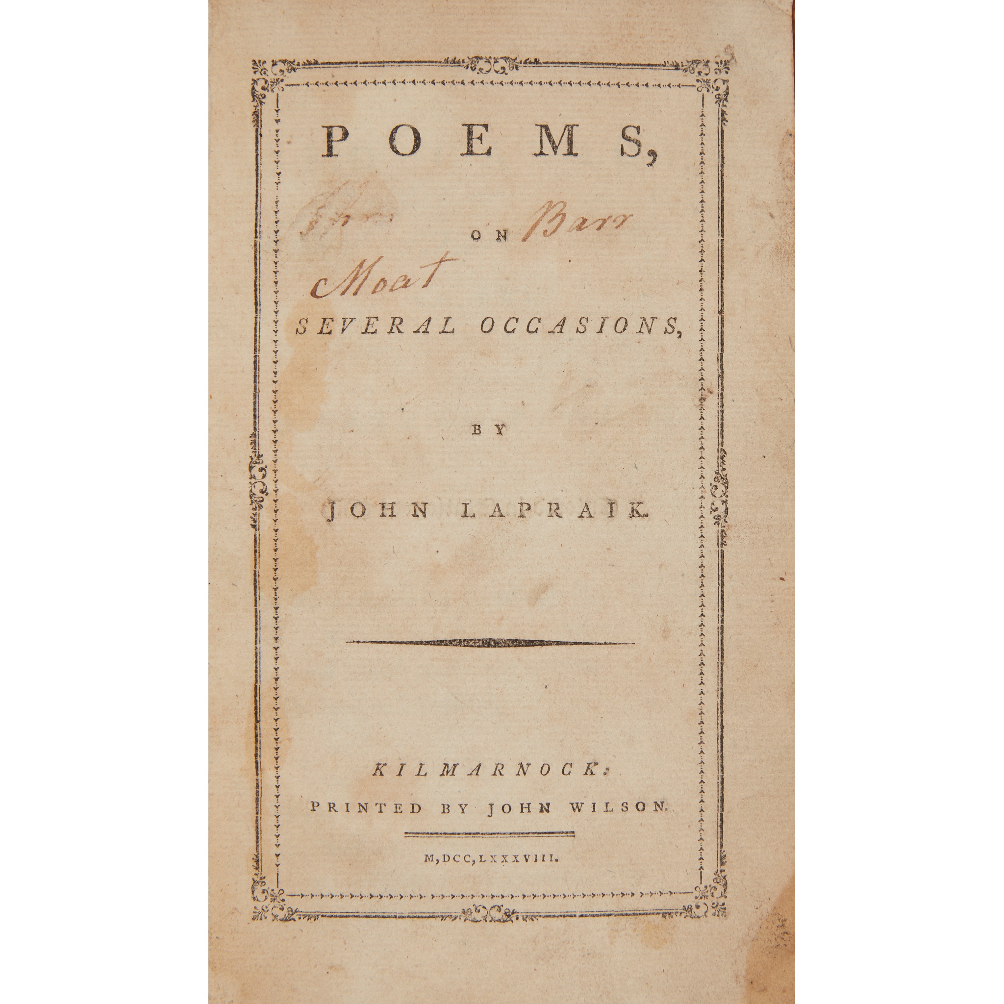 Kilmarnock: John Wilson, 1788. First edition, 8vo, half calf, lacking four leaves, early ownership inscription "Barr Moat" to title-page and a few notes and marks throughout, some browning and spotting [ESTC T124917 listing 17 copies, the work is, however, rare on the market]