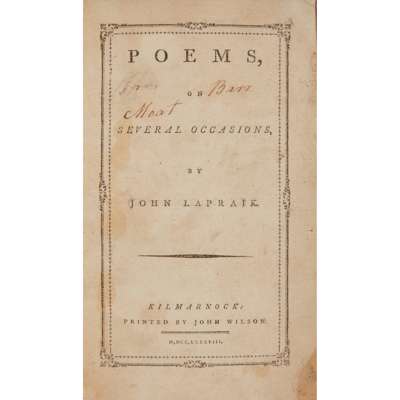 Note: Born in Ayrshire, Lapraik was a contemporary and friend of Robert Burns. Burns penned three epistles to Lapraik in 1785 and the two were in correspondence, and both poets used the same printer when publishing their works in Kilmarnock in the 1780s. Burns, whose work had been published two years prior to Lapraik's, was evidently the more successful!