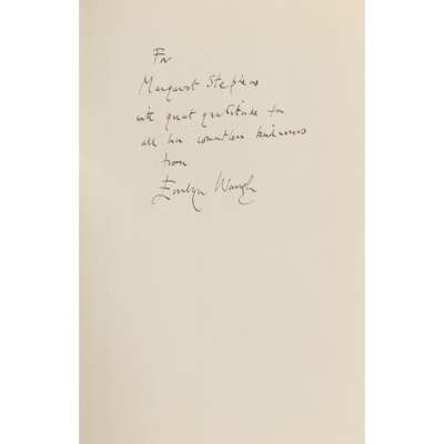 London: Chapman & Hall, 1952. First edition, 8vo, inscribed and signed by Waugh: "For Margaret Stephens with great gratitude for all her countless kindness, from Evelyn Waugh", original blue cloth, dust-jacket not price-clipped, a few small chips and tears and some light dust-soiling to jacket