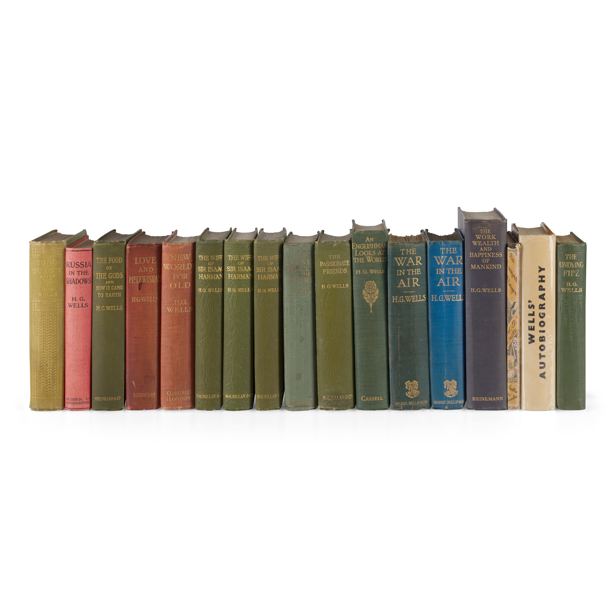 Love and Mr Lewisham. 1900, first edition, original red cloth, spine slightly faded, owner's name on front free endpaper; The Food of the Gods and how it came to Earth. 1904, first edition, original green cloth, owner's name on front free endpaper; New Worlds for Old. 1908, first edition, original red cloth gilt, spine faded; The War in the Air. 1908, first edition, 8vo, original blue cloth gilt, some fading and rubbing; another copy, later issue; Tono-Bungay. 1909, somewhat spotted, binding dampstained; The Wife of Sir Isaac Harman. 1914, first edition, original green cloth gilt; and two further copies; Russia in the Shadows. [1920], plates, original red cloth; The Secret Places of the Heart. 1922, first edition, original green cloth gilt, ownership signature to flyleaf, some light foxing; The Passionate Friends. 1913, first edition, 8vo, ownership signature to front free-endpaper, original green cloth gilt; An Englishman Looks at the World. 1914, first edition, 8vo, original green cloth gilt; The Work, Wealth and Happiness of Mankind. 1932, first edition, 8vo, original blue cloth gilt; The Croquet Player. 1936, original mottled cloth, dust-jacket with some wear; and one volume of Well's autobiography (16)