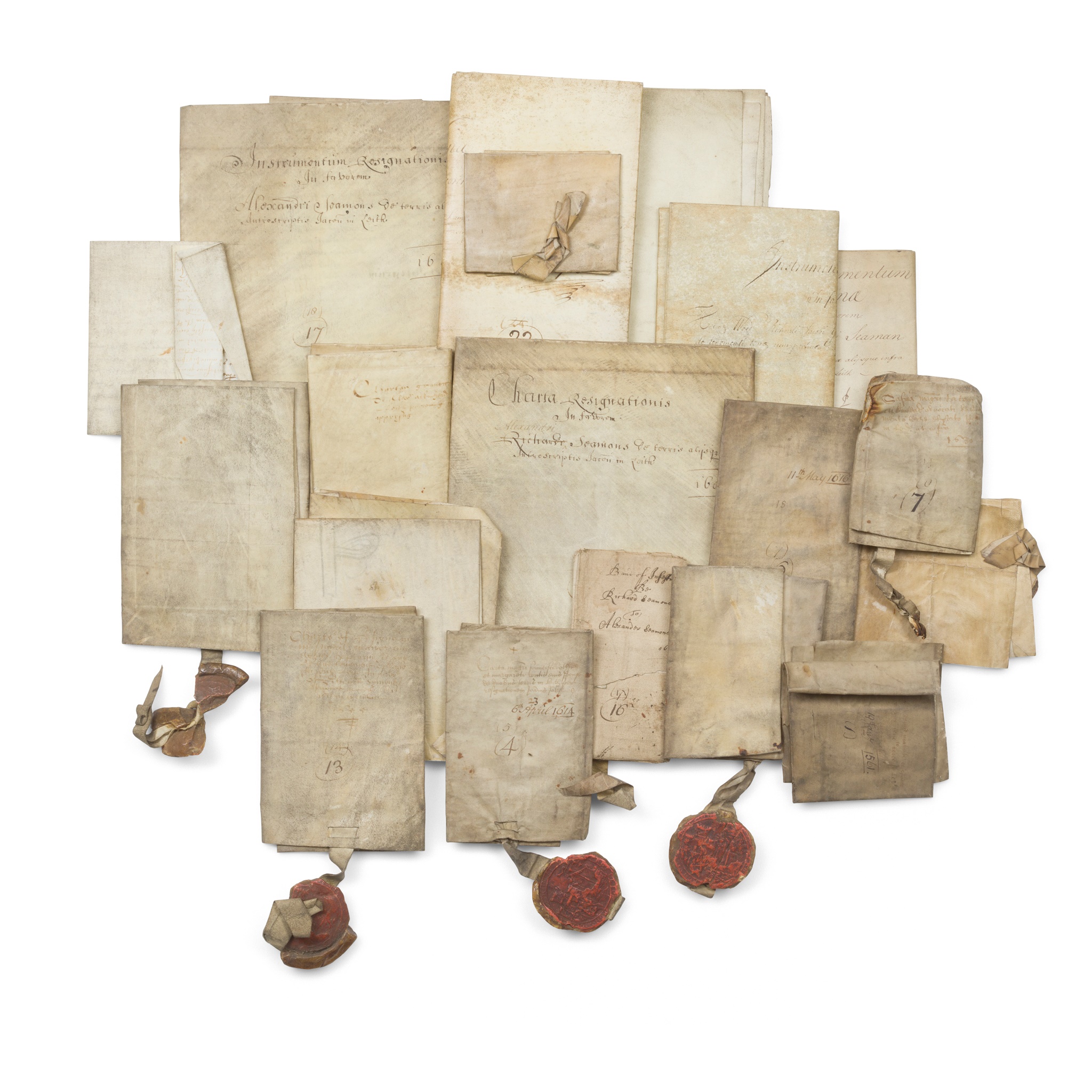 Instrument of Sasine in favour of Elizabeth Burntsfield of ane tenement of land... lying in Leith, 26th May 1682; Instrumentum Resignationis in favour of Alexander Seamon, 1684; Charta Resignationis in favour of Alexander Seaman of land in Leith, 1684; Preceptum.. in favorem Alexander Seaman, 1763; Instrument of Sasine in favour of Alexander Seaman of land in Leith, 1763; Indenture in Latin dated 22nd Dec. 1647; Indenture in Latin dated 14th July 1574 with small wax seal, writing rubbed in places; Instrument of Sasine in favour of Richard Seaman of land in Leith, 1726; 9 similar 17th century indentures, several with seals, 1 other 18th century, and 4 others, all but 2 on vellum, folded (21)