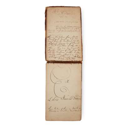 310+62pp, late 17th or early 18th century, volume marked “Ex Libris Jo. Drummond Vol. IX” inside and “IX9” to fore-edge, and is filled with commentaries and arguments on Biblical passages, written largely from the top of the page down, then changing direction at some point, from the bottom of the page up, binding detached, textblock split, several gatherings loose, a transcription of the main part of the first page reads: Received this volume from Mrs McNaughton of Vaughan U.C. [Upper Canada, i.e. Ontario] Who Had it from her Maternal Uncle Alexd McLauren Esq of Broich Perthshire Scotland, a Great Grandson of the Author — There were one hundred & Seventy Volumes of the Same Kind all of the Same author besides many other M.S.S. in the Library at Broich ___ W. Rintoul, October 14th 18[3?]9, bookplate of The Fraser Institute Free Public Library, Montreal, Presented by Willam Rintout [seemingly a misspelling of Rintoul]