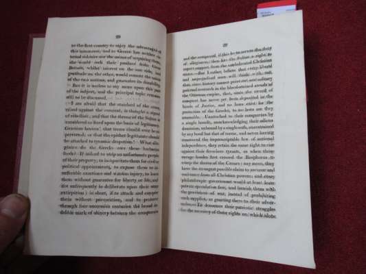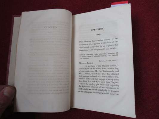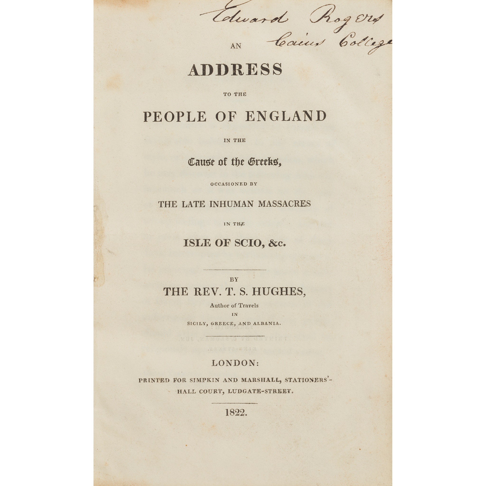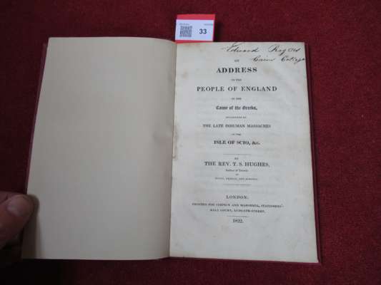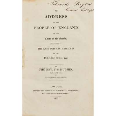 occasioned by the late inhuman massacres in the Isle of Scio, &c. By the Rev. T.S. Hughes, author of Travels in Sicily, Greece and Albania. London: printed for Simpkin and Marshall, 1822. First edition, 8vo, [iv], 44, inscribed at head of title 'Edward Rogers Caius College', modern red quarter morocco