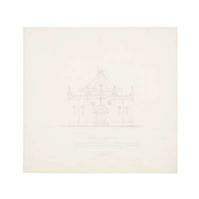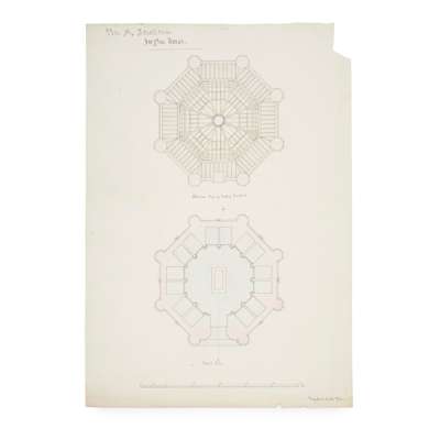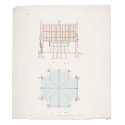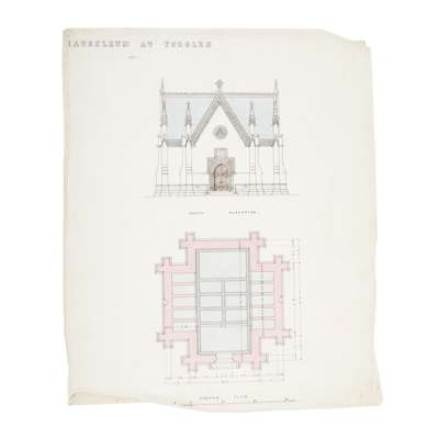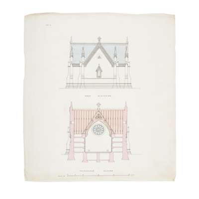 folio containing designs for the mausoleum at Forglen House, Aberdeenshire, dated 1864, including colour illustrations of the North Elevation, Ground Plan, South Elevation, Foundation Plan, Longitudinal Section, Plan of Roof, West Elevation and Transverse Section on four sheets of tracing paper, and a further five sheets of paper with detailed designs and plans for the mausoleum, several coloured, a little dampstaining in places