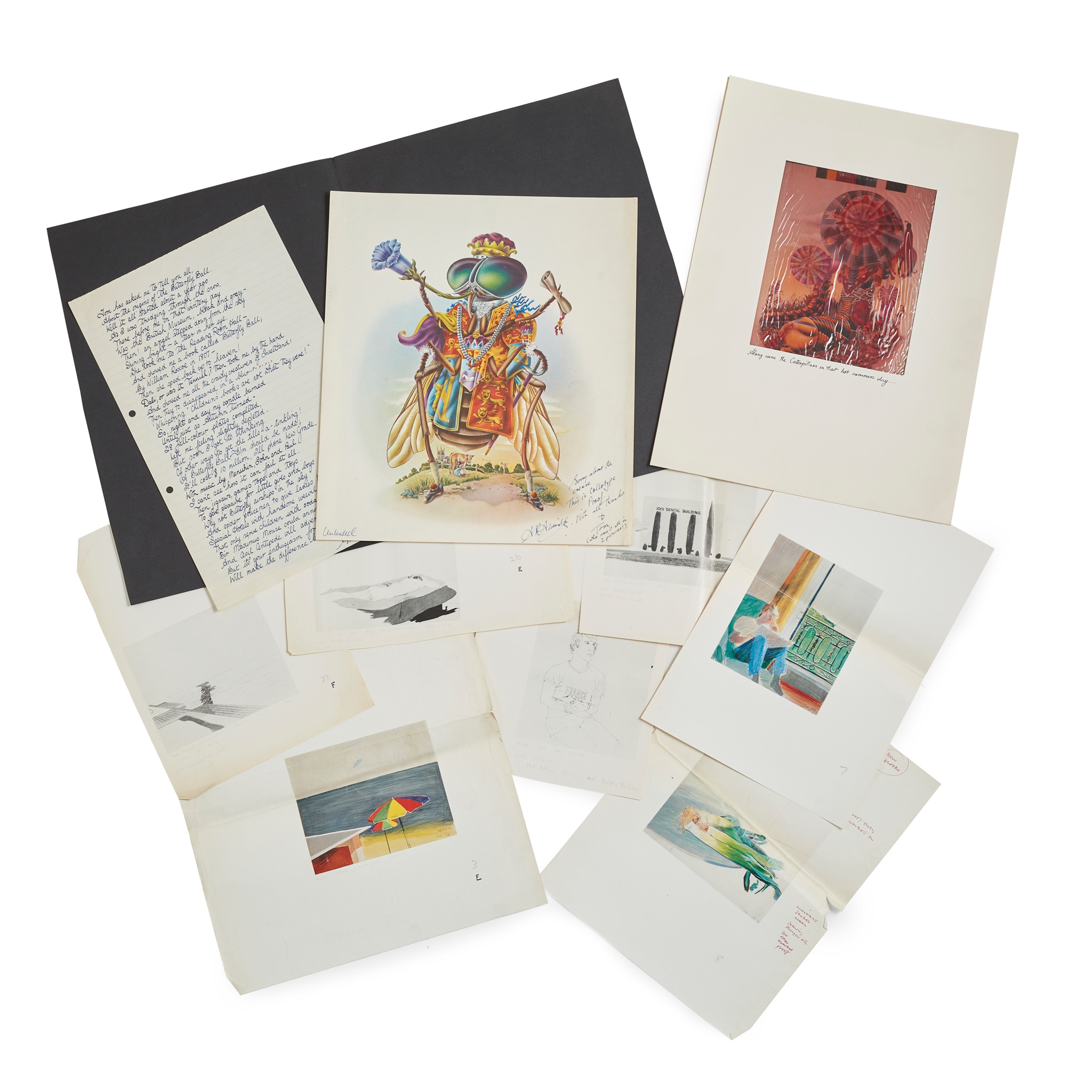 Aldridge, Alan.ALS in the form of a poem, explaining "...the origins of The Butterfly Ball," 36 lines on foolscap paper, with a collotype proof plate from the work, signed with a note from Aldridge, 33 x 29cm. and another image from the work, on acetate, 21.5 x 16.5cm; Bachem, Bele Two prints, with pencil annotations, each c.21 x 15cm; Bradley, Helen Three prints, each c.24 x 27cm; Hockney, David 68 proof prints for a publication on Hockney, many annotated by publisher, mostly folded (quantity)