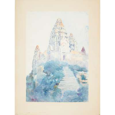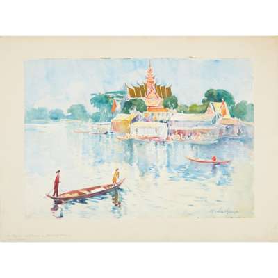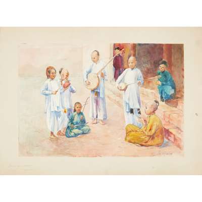 Danseurs Royaux. Bangkok, 36.3 x 24.8cm; Jeunes Musiciennes. Annam, 24.2 x 35.8cm; Scenes de la Rue, 38 x 55.2cm; Mandarin du Laos, 36 x 24.5cm; Indo-Chinois Musulmans, 24.5 by 36cm; La pagoda du Fleuve a Compong Huong, Cambodge, 24.5 x 36cm; Les ruines d’Angkor. (Ancien Royaume Khmer), 36 x 24.5cm; Elephant Allant au Bain, 24.2 x 36cm; Buffles du Laos, 24.5 x 36cm; Indigene, Haut Mekong, 35.5 x 24.5cm; Pagode de Dagon, 24.2 x 36cm; Jeunes enfants de la presqu’ile Sud indo-chinoise, 36 x 24.8cm; comprising 11 watercolours on paper laid down on paper, 1 oil on canvas, all signed (12)