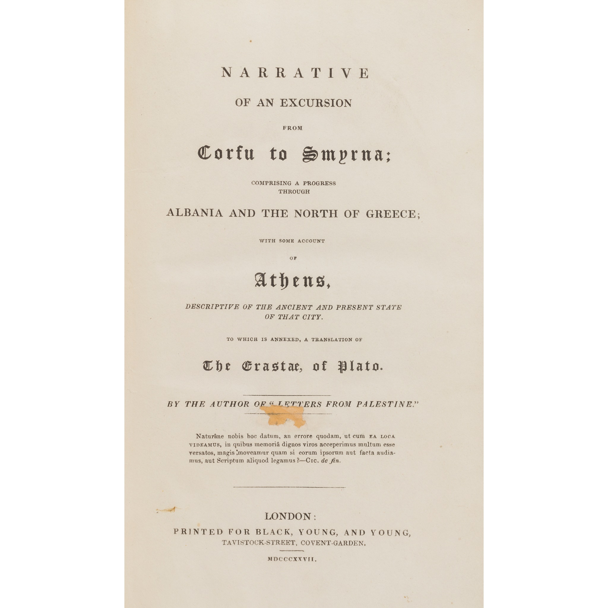 comprising a progress through Albania and the North of Greece with some account of Athens... London: Black, Young, and Young, 1827. First edition, 8vo, hand-coloured frontispiece present which does not appear in several other copies, without half-title, contemporary calf neatly rebacked with gilt-tooled spine, endpapers renewed, some light foxing, [Blackmer 879]