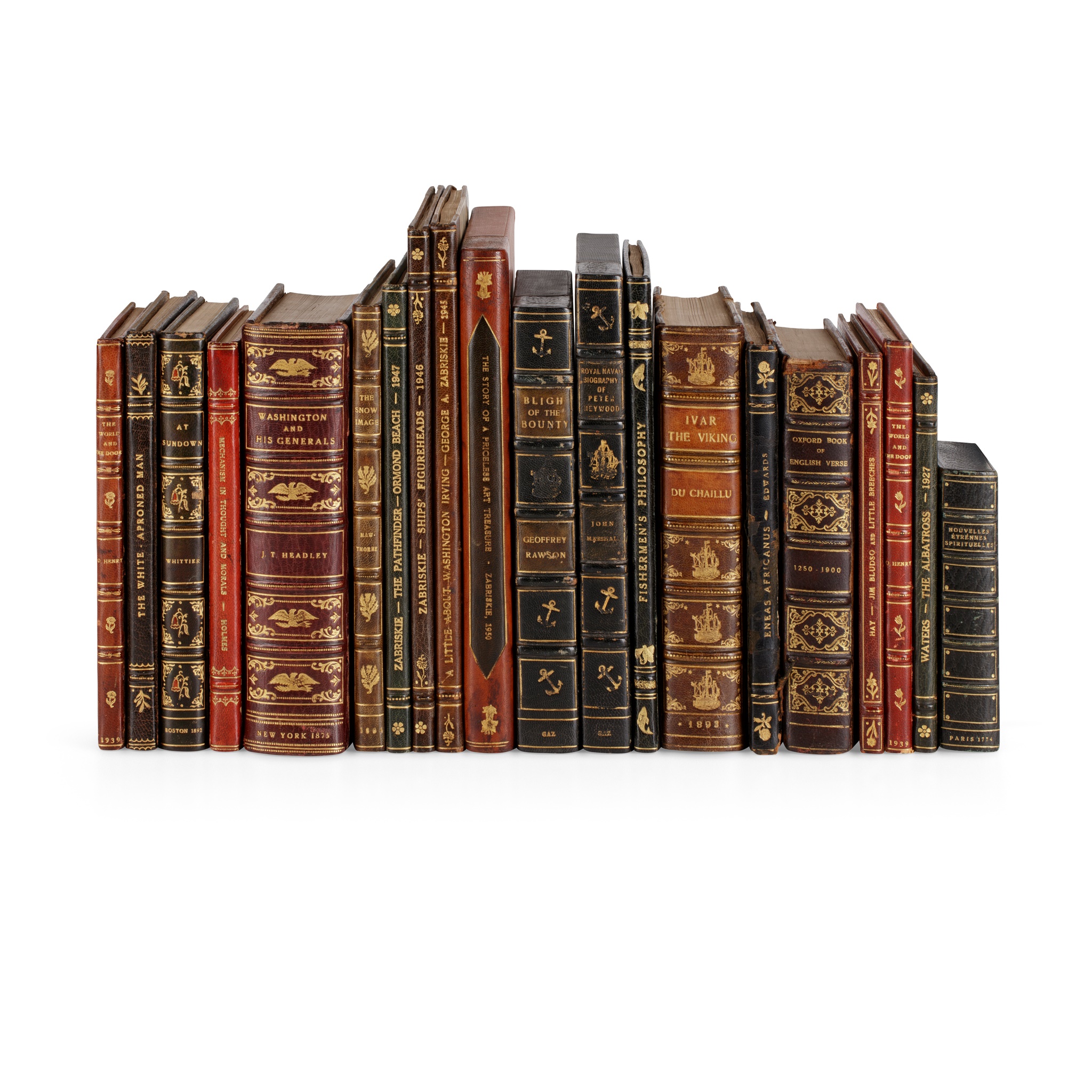 Headley, J.T. Washington and His Generals. New York: Scribner, Armstrong & Co, 1873. 8vo, fine binding by Zabriskie in burgundy morocco gilt with small red onlays, blue and burgundy morocco gilt endpapers with a miniature of Washington inlaid to the front paste-down endpaper, with Zabriskie's bookplate (detached) and a dedication to his brother, Edward, loosely inserted ALS dated 1852 from Headley, joints a little scuffed; Marshall, John Royal Naval Biography of Peter Heywood, one of the Survivors of the Mutiny on the Bounty. New York: George R Gorman, [n.d.] First US edition stated in pen inscription by the publisher, George Gorman, 8vo, slipcase in blue quarter morocco gilt by George A Zabriskie; Rawson, Geoffrey Bligh of the Bounty. New York: George R. Gorman, 1936. Stated in pen inscription by the author to be the US first edition and inscribed to Zabriskie, 8vo, blue cloth gilt with blue quarter morocco gilt slipcase by Zabriskie; Hawthorne, Nathaniel The Snow Image. New York: James G. Gregory, 1864. 8vo, illustrated by Marcus Waterman, Zabriskie style binding in blue half morocco gilt, without binder's mark; Zabriskie, George A. Ship’s Figureheads in and about New York. Ormond Beach, Florida, 1946. 8vo, Zabriskie binding in brown half morocco gilt, with a personal dedication written and signed by George A Zabriskie, to Edward & Gertrude; Zabriskie, George A. A Little about Washington Irving, Ormond Beach, Florida, 1945. 8vo, Zabriskie binding in brown half morocco gilt, with a personal Christmas dedication to Edward C.; Henry, O. The World and the Door. Ormond Beach, Florida 1939. 8vo, Zabriskie Christmas present binding in red morocco gilt with green morocco gilt panel to upper cover, with a personal Christmas dedication to Eliza and Marnie; Waters, Frank The Albatross. Cliffdale, Alpine New Jersey, 1929. 8vo, Zabriskie-style binding in blue half morocco gilt, with printed dedication page "to all mariners from George A Zabriskie"; Zabriskie, George A. Fishermen’s Philosophy... Ormond Beach Florida, 1935. 8vo, a Zabriskie Christmas binding in blue morocco with gilt fish motifs, dedicated to Edward C. With an ALS from Zabriskie to Edward, and a fishing fly attached to a front page blank, with another dedication; Hay, John Jim Bludso of the Prairie Belle, and Little Breeches. Boston: James R Osgood, 1871. First edition, 8vo, Zabriskie style binding in brown morocco gilt with hand-printed orange-gilt endpapers, without maker's mark, ALS from the author bound in; Holmes, Oliver Wendell Mechanism in Thought and Morals. Boston: James R. Osgood, 1871. First edition, 8vo, Zabriskie binding in red morocco gilt, with his library plate and manuscript dedication to Edward dated Sep 7th 1941, clipped author's signature cut from a letter, and stuck down on the last page of the preface; Zabriskie, George A. The Story of a Priceless Art Treasure. Ormand Beech, 1950. 8vo, cloth gilt and orange-brown quarter morocco gilt slipcase by Zabriskie; Henry, O. The World and the Door. Ormond Beach, Florida 1939. 8vo, Zabriskie Christmas present binding in ochre morocco gilt with green morocco gilt panel to upper cover, with a personal Christmas dedication to Edward and Gertrude; Whittier, John Greenleaf At Sundown. Boston: Houghton Mifflin, 1892. 8vo, Zabriskie binding in blue morocco gilt with setting sun motifs in orange to covers and orange morocco gilt endpapers, ALS from the Author tipped-in; Couch, Arthur Quiller The Oxford Book of English Verse. Oxford: Clarendon Press, 1925. 8vo, red morocco gilt Zabriskie binding, Zabriskie bookplate, upper cover detaching, with ALS signed by Quiller Couch; Juniper, Rev. Kerrison. "The White-Aproned Man". The Doldrums, Ormand Beach, 1940. 8vo, Zabriskie Christmas gift binding in brown morocco gilt; Zabriskie, George A. The Pathfinder. The Doldums, Ormond Beach, 1947. 8vo, Christmas gift binding by Zabriskie in blue half morocco gilt, with printed and signed dedication to Edward and Gertrude; Edwards, Harry Stillwell Eneas Africanus. Macon, Georgia: J.W. Burke, 1923. 8vo, Zabriskie-style binding black half calf gilt, with his inscription to Edward and Gertrude, signed by the author, covers detached; Nouvelles Etrénnes Spirituelles... Paris: [De Hansy, 1774.] 16mo, full-page and vignette woodcuts, black morocco gilt with centre panels of red and silver foil with painted ducal coat of arms, title-page torn with loss, trimmed, blue morocco gilt Zabriskie slipcase; Du Chaillu, Paul Ivar the Viking. New York: Charles Scribner, 1893. First edition, 8vo, Zabriskie-style green half morocco gilt, signed by the author with an ALS; Wilkie, Wendell One World. New York: Simon and Schuster, 1943. Presentation copy to Zabriskie, housed in a slipcase made by him; conditions vary, it is strongly recommended to request a condition report (21)