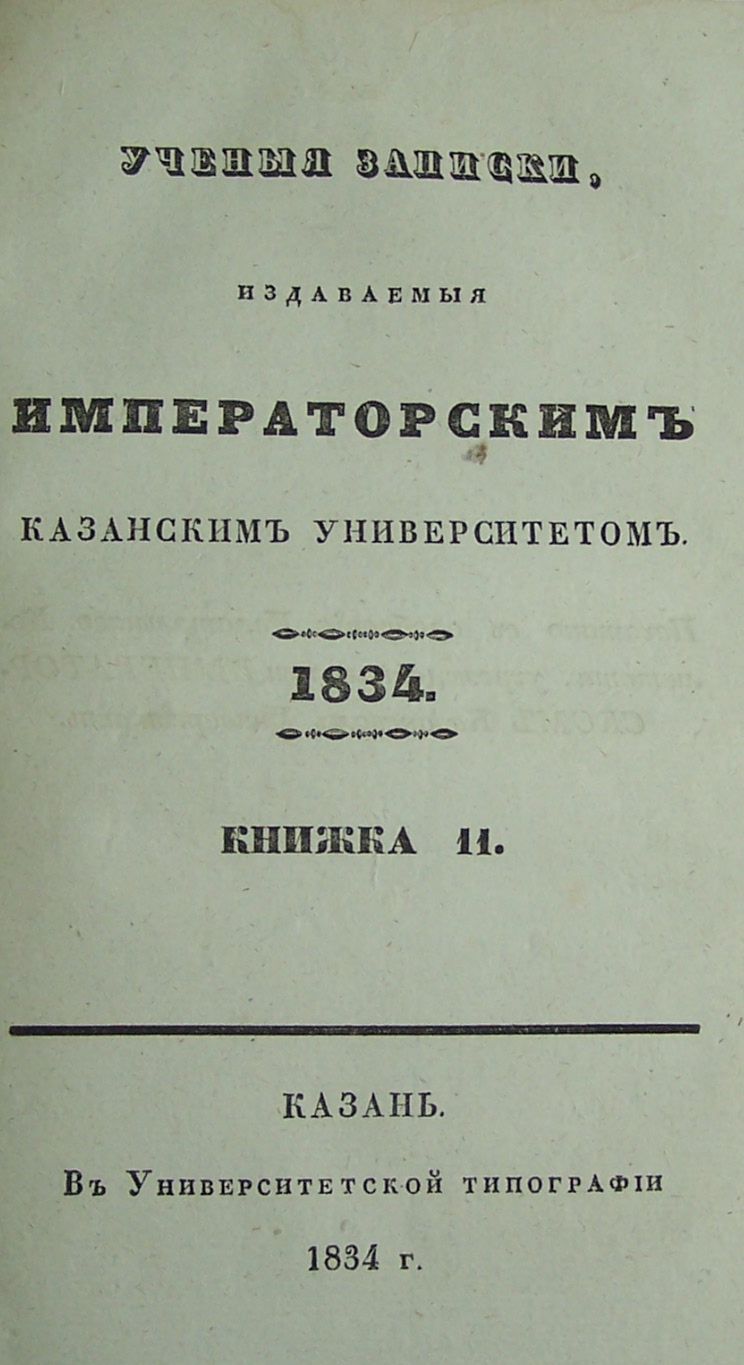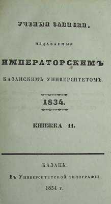 in: Uchenye Zapiski Kazanskogo Universiteta, book 11 (pp.167-226 only). Kazan: University Press, 1834. 8vo, 22 x 14cm, contemporary marbled boards, rebacked with calf