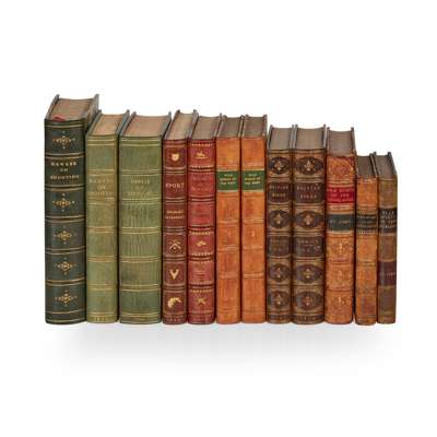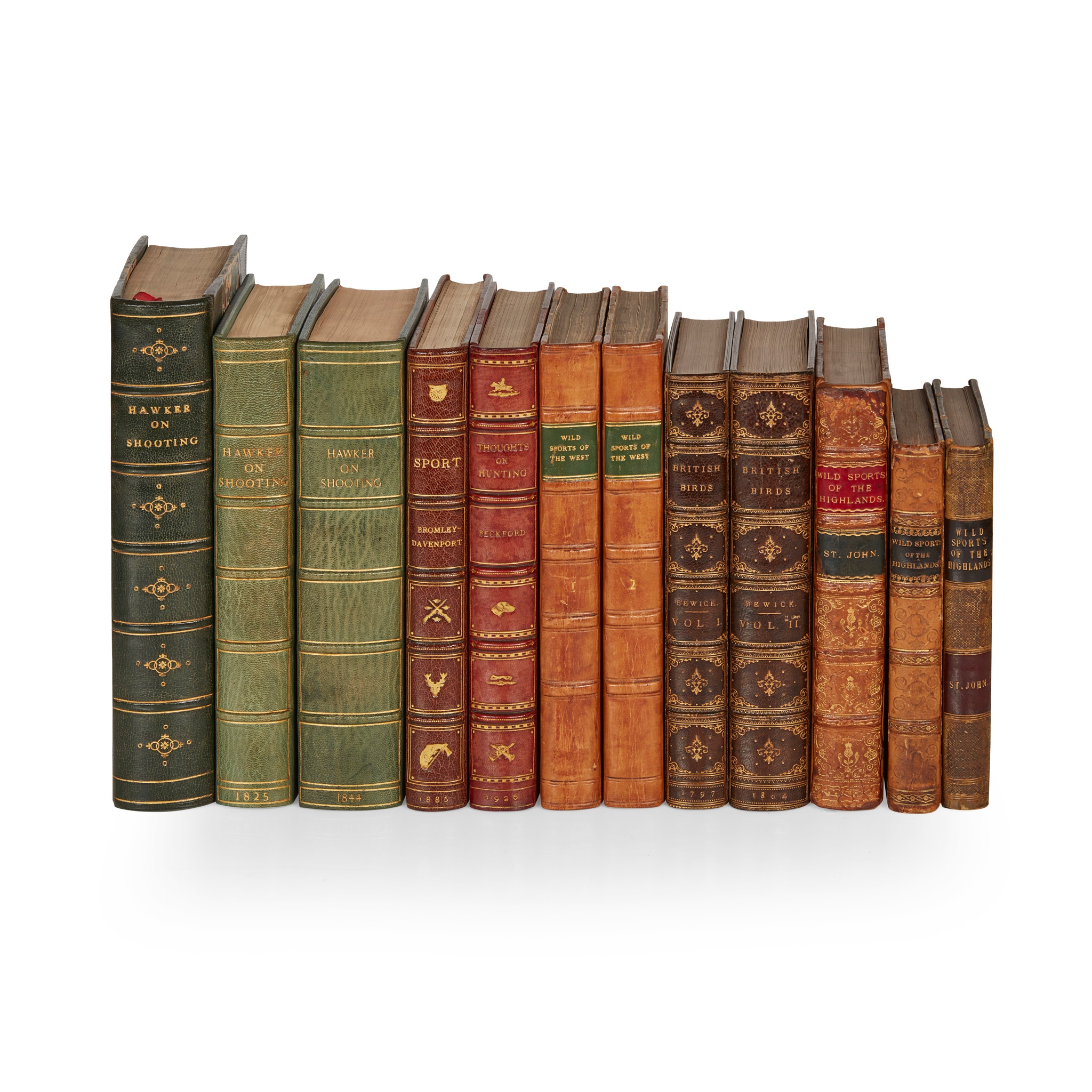Bewick, Thomas History of British Birds. Newcastle: Beilby & Bewick, 1797-1804. First edition, 2 volumes, 8vo, uncensored vignette in volume 1 p.285, brown morocco gilt by Zaehnsdorf, bookplates; Hawker, P., Lt. Col. Instructions to Young Sportsmen. London: Longman, Hurst, Rees, Orme, Brown, and Green, 1824. Third edition, 8vo, hand-coloured lithograph frontispiece and 9 plates (including three hand-coloured), later dark green half morocco gilt; [Idem] Instructions to Young Sportsmen. London: Longman, Hurst, Rees, Orme, Brown, and Green, 1825. Fourth edition, 8vo, later blue morocco gilt; [Idem] Instructions to Young Sportsmen. London: Longman, Hurst, Rees, Orme, Brown, and Green, 1844. Ninth edition, 8vo, later blue morocco gilt; St. John, Charles Sketches of the Wild Sports & Natural History of the Highlands. London: John Murray, 1878. 8vo, contemporary tree calf neatly rebacked, Selborne bookplate, ownership inscription; [Idem] Short Sketches of the Wild Sports & Natural History of the Highlands. London: John Murray, 1846. 8vo, contemporary half calf, bookplate, ownership signature and pencil notes; [Idem] Short Sketches of the Wild Sports & Natural History of the Highlands. London: John Murray, 1846. 8vo, contemporary half calf; [Maxwell, Richard Hamilton] Wild Sports of the West. London: Richard Bentley, 1832. 2 volumes, 8vo, contemporary half calf, neatly rebacked; Bromley-Davenport, W. Sport. London: Chapman and Hall, Limited, 1885. 8vo, 20th century brown half morocco with gilt sporting motifs to spine; Beckford, Peter Thoughts on Hunting. London: Methuen & Co. Ltd., 1926. Sixth edition, 8vo, contemporary red half morocco with gilt sporting motifs to spine, bookplate (12)