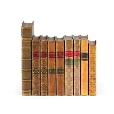 The Topography and Antiquities of Rome… London: Longman, Rees, Orme, Brown and Green, 1831. 2 volumes, 8vo, 12 plates, contemporary half calf gilt with red and green morocco labels to spines, bookplates of R.M. Beverley; Gilly, William Stephen Narrative of an Excursion to the Mountains of Piemont, in the year MDCCCXXIII… London: C. and J. Rivington, 1826. Third edition, 8vo, 2 folding maps and 3 folding plates, contemporary calf, Fasque bookplate; Forsyth, Joseph Remarks on Antiquities, Arts, and Letters during an excursion in Italy, in the years 1802 and 1803. London: John Murray, 1816. Second edition, 8vo, with half-title, contemporary calf gilt, Fasque bookplate, joints slightly cracked; [Moore, John] A View of Society and Manners in France, Switzerland and Germany… London: W. Strahan and T. Cadell, 1779. 2 volumes, 8vo, contemporary tree calf gilt with red and green morocco labels to spines, neat stamps of Den Damph Forest Library to paste-down endpapers; Piozzi, Hester Lynch. Observations and Reflections made in the course of a Journey through France, Italy and Germany. London: A. Strahan and T, Cadell, 1789. 2 volumes, 8vo, without advertisements, contemporary tree calf gilt with red and green morocco labels to spines, neat stamps of Den Damph Forest Library to paste-down endpapers and stamps of the Earl of Lovelace; Lumsden, Andrew Remarks on the Antiquities of Rome. London: W. Bulmer and Co., 1797. 4to, portrait, 2 folding maps, 3 folding plates and 7 single plates, contemporary green half morocco gilt (9)