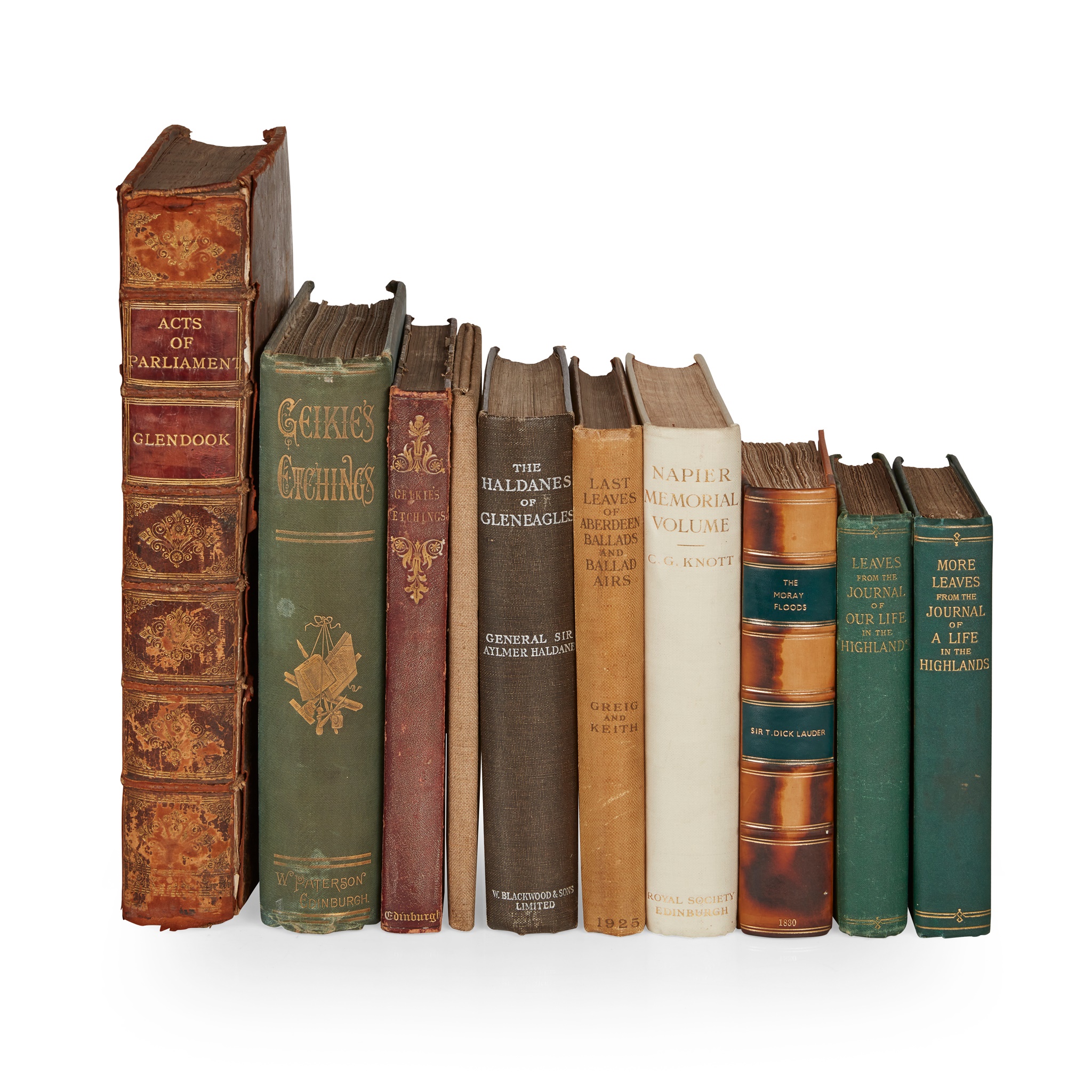 The Laws and Acts of Parliament made by King James the First, Second... Edinburgh: printed by David Lindsay, 1681. Folio, engraved coat of arms, additional engraved title-page, title-page in red and black, 9 portraits, contemporary calf, lacking inserted leaves between p.2O2 and 2O3 which should be entitled "The King's Majestie's Letter...", rubbed, joints split; Manuscript: "A few Scenes of Scottish Story, to cousin Carlie, with love from E. Sinne". [c.1870], 4to, 9 leaves of original pen and ink illustrations mounted on thick card with manuscript verses on verso, pictorial cloth with ties; Victoria, Queen Leaves from the Journal of our Life in the Highlands. 1868; More Leaves from the Journal of a Life in the Highlands. 1884, plates, original green cloth and original pictorial green cloth, the first lightly rubbed; Lauder, Thomas Dick An Account of the Great Floods of August 1829. Edinburgh, 1830, Second edition, 8vo, plates, maps, modern quarter calf, uncut; Haldane, Gen. Sir J. A.L. The Haldanes of Gleneagles. 1929, presentation copy to B.E.A. Napier, and with autograph letter from author, bookplate (slightly damaged) of Hon. Wm. Napier loosely inserted, original decorated cloth gilt, t.e.g.; Knott, C.G. Napier Tercentenary Memorial Volume. 1915. 4to, presentation copy to John Scott Napier, original white buckram gilt, t.e.g.; Geikie, Walter Etchings illustrative of Scottish Character and Scenery. [c. 1853]. 4to, 94 etched plates, contemporary maroon half morocco, slightly rubbed; Geikie, Walter Etchings illustrative of Scottish Character and Scenery. 1884. 4to, one of 50 copies with proof impressions of the plates on India Paper, original blue pictorial cloth gilt, uncut, binding lightly soiled; Greig, G .and A. Keith Last leaves of Traditional Ballads and Ballad Airs. Aberdeen, 1925. 4to, original buckram, t.e.g. (10)