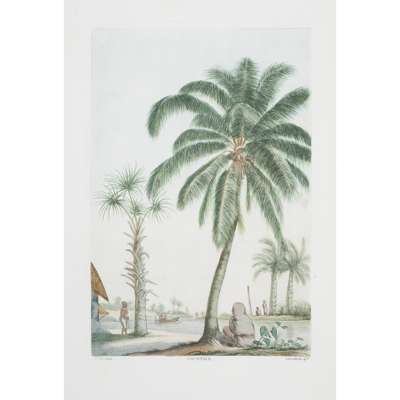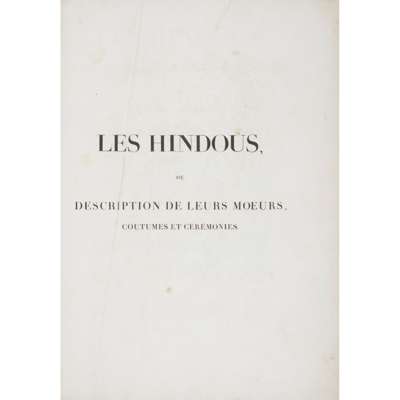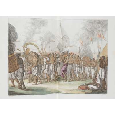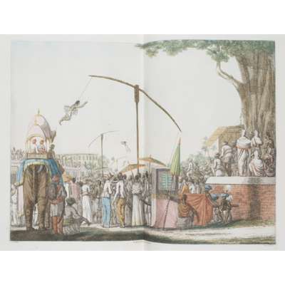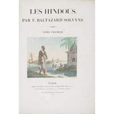 Dutch native, Balthasar Solvyns, travelled to Calcutta at the end of the 18th century and worked as an artist, providing illustrations for a report by Alexander Kyd on his expedition to Penang and the Andaman Islands. Observing that the British displayed a keen interest in Indian costume and culture, Solvyns was inspired produce “A Collection of Two Hundred and Fifty Coloured Etchings Descriptive of the Manners, Customs, and Dress of the Hindoos” in 1799. The present work is an enlarged version of this, with a total of 288 plates with text in French and English.