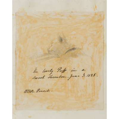 Note: Following a separation from Lord Byron in 1815, and Lord Byron's death in 1824, Lady Byron and her daughter, Ada, became the tenants of Bifrons Mansion House, near Canterbury. This album seems to have been a Christmas present to a relative or friend named I. Sharpe who celebrated with the family at the house in 1828, when Ada was just 14 years old. The poem, "Dear object of my tender care,/ Which neither dog nor bird may share,/ Of all the feline tribe most rare, My pussy!" is attributed by Sharpe to the young Ada and runs to four stanzas. The quantity of writings later in the album attributed to I. Noel suggests that Sharpe may have been Ada's maternal aunt or a cousin, Noel being one of Lady Byron's family names. Ada Byron, Lord Byron's daughter, became Ada Lovelace in 1835 and is renowned for having published the first computer algorithm.