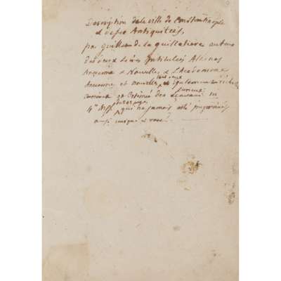 Note: This unpublished work, by the author of Athènes ancienne et nouvelle, 1675, and Lacédémone ancienne et nouvelle, 1676, both published under the name of his brother Guillet de la Guilletière, was possibly intended as a continuation of L'etat present de l'empire des Turcs, contenant la vie du Sultan Mahamet IV, found in the author's history of Athens mentioned above. The manuscript was at one time in the possession of the antiquary and author B.-B. Moreau de Mautour, who has initialled each page except the last, which has his signature, and who has made a number of revisions to the text.