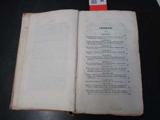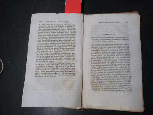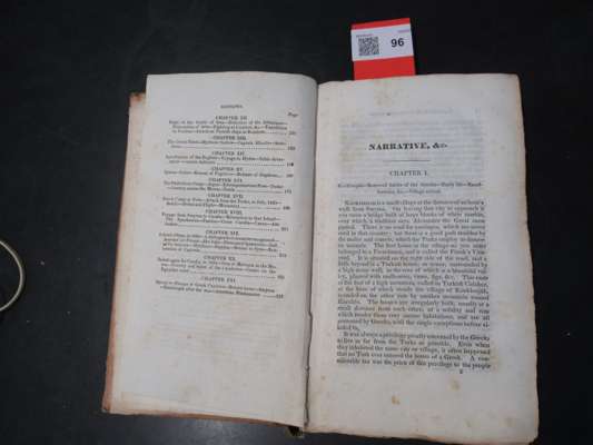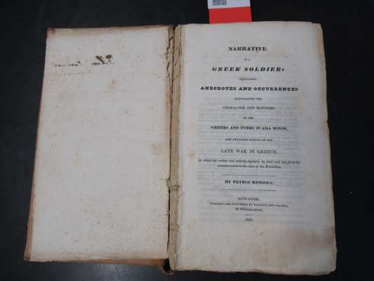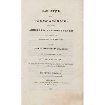 containing Anecdotes and Occurrences illustrating the Character and Manners of the Greeks and Turks in Asia Minor, and detailing events of the late war in Greece. New York: Elliott and Palmer, 1830. First edition, 12mo, original cloth-backed boards, slightly spotted, lacks spine, upper board detached