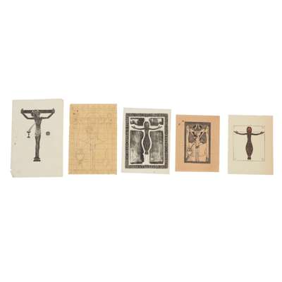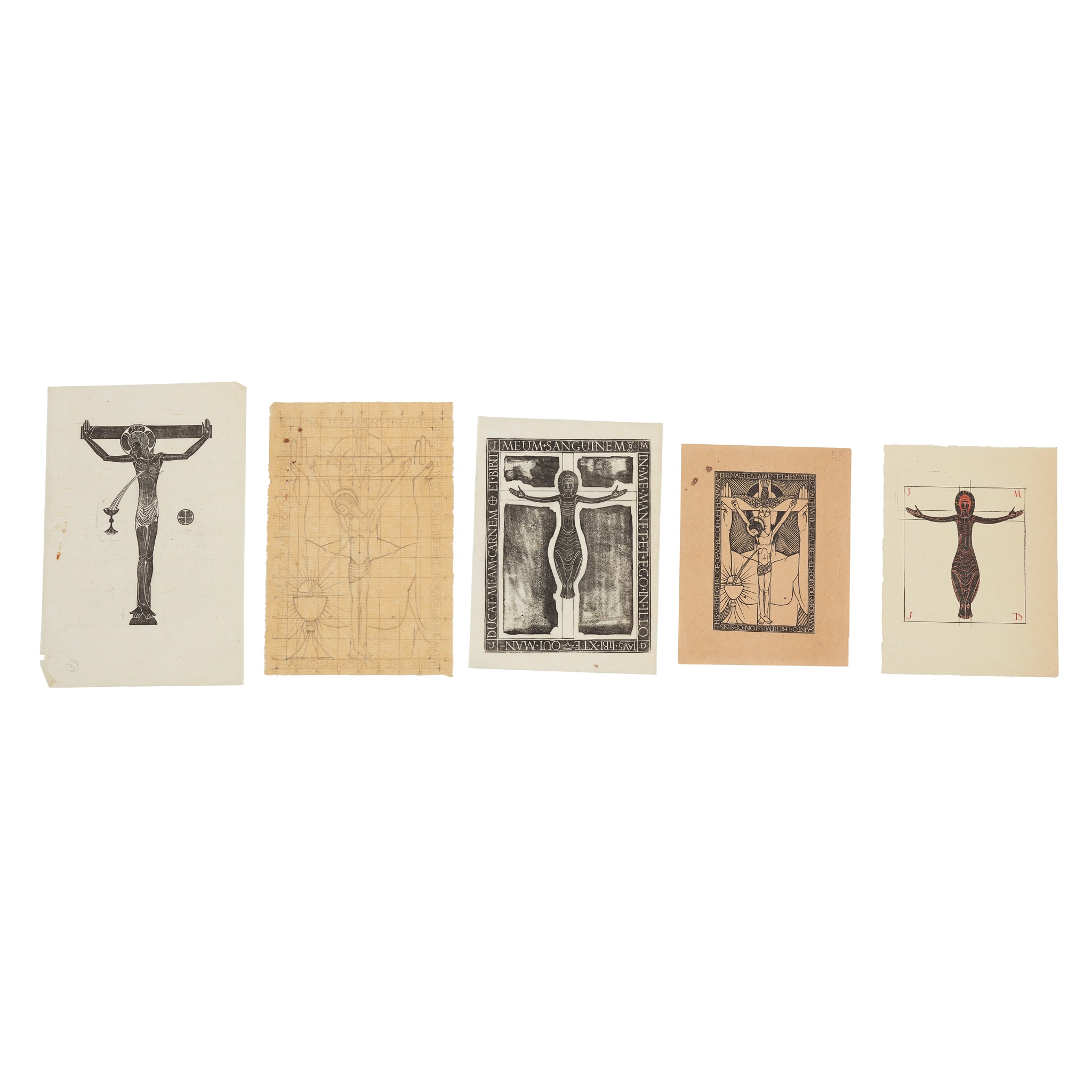 pencil on tracing paper, 17.1 x 11.6cm, browned, rust-holes upper left, together with a proof wood-engraving of the same design, 13.8 x 10.6cm, 2 pin-holes and associated rust-staining to margin [Skelton P22], and 3 further proof wood-engravings: Crucifix, Chalice and Host, 1915 [Skelton P22] and Crucifix, 1919, 2 copies [cf. Skelton P151, one copy evidently a different state, without the border and enclosed text as depicted in Skelton, but with corner letters and infill in red, apparently added by hand rather than printed]