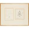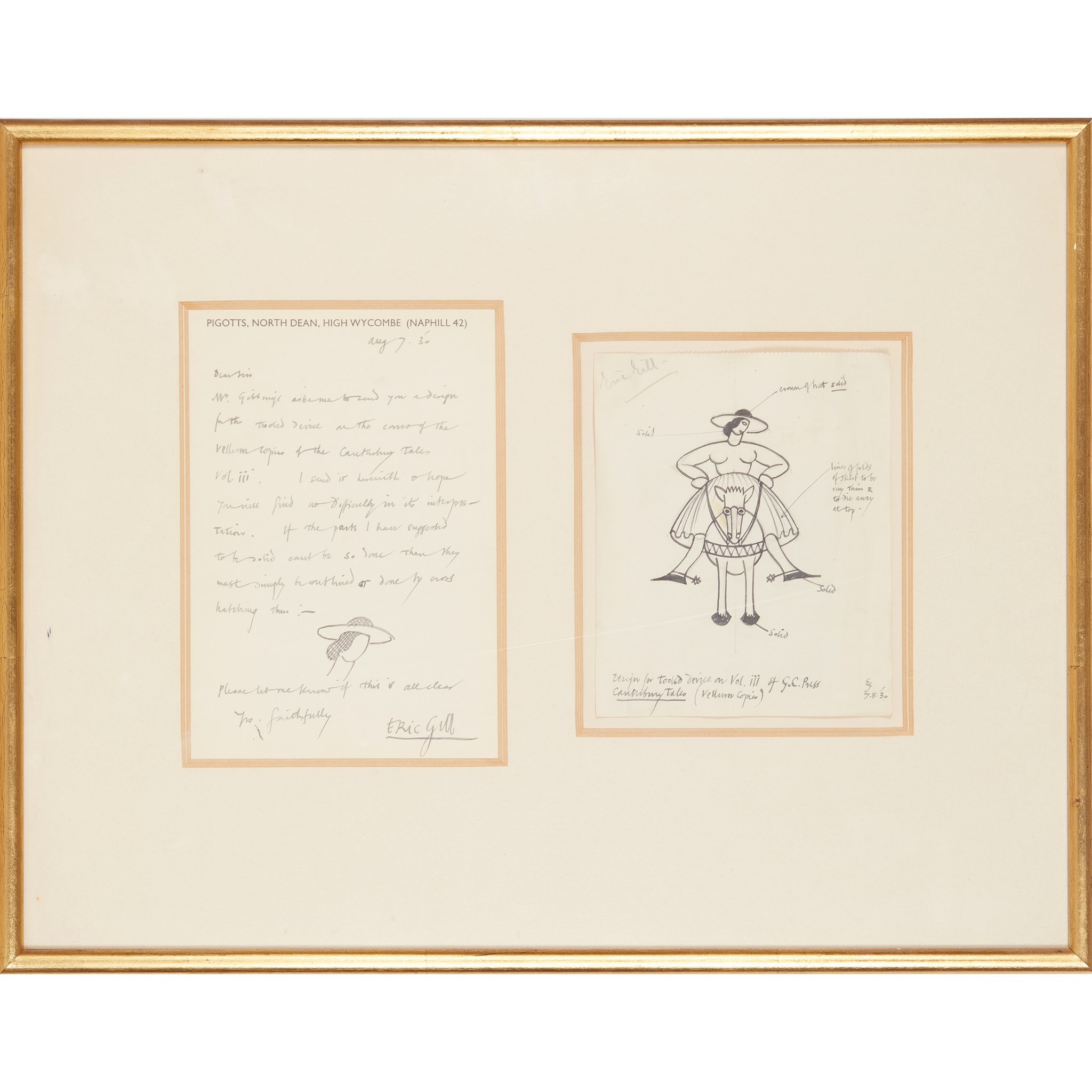 depicting the Wife of Bath astride a horse, pen and ink with pencil, 14.5 x 12cm, signed and dated 'EG 7.8.30' lower right, annotated by Gill, captioned 'Design for tooled device on Vol. III of G. C. Press Canterbury Tales (vellum copies)' by him at foot, in double-aperture mount with an autograph letter signed by Gill commenting on the design and containing a pen-and-ink sketch showing an alternative design, framed and glazed