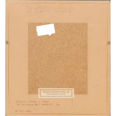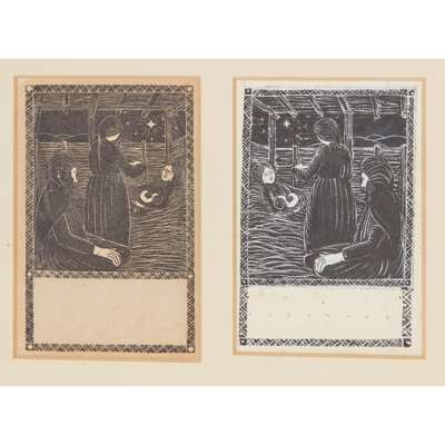1. Nativity with Midwife, St Joseph Seated, [1910], original Christmas card design for Roger Fry, mount aperture 9 x 6cm, in triple aperture mount with the printed wood-engraving [Skelton P10] and a pencil inscription by Gill 'To Ethel from Eric on return from Brussels Exhib[ition]', backboard with printed label reading 'Original drawing by Eric Gill from the Gill family collection', acquisition note 'G. Sims 1985' and other annotations;