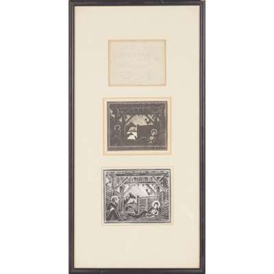 3. Christmas Gifts, [1916], in triple aperture mount with two related wood-engravings, Christmas Gifts: Dawn [Skelton P81] and Christmas Gifts: Daylight [Skelton P80], these identified in label on verso respectively as a 'proof engraving' and 'printed on card', framed and glazed, printed label on backboard ('Original drawing by Eric Gill ...')