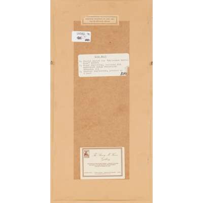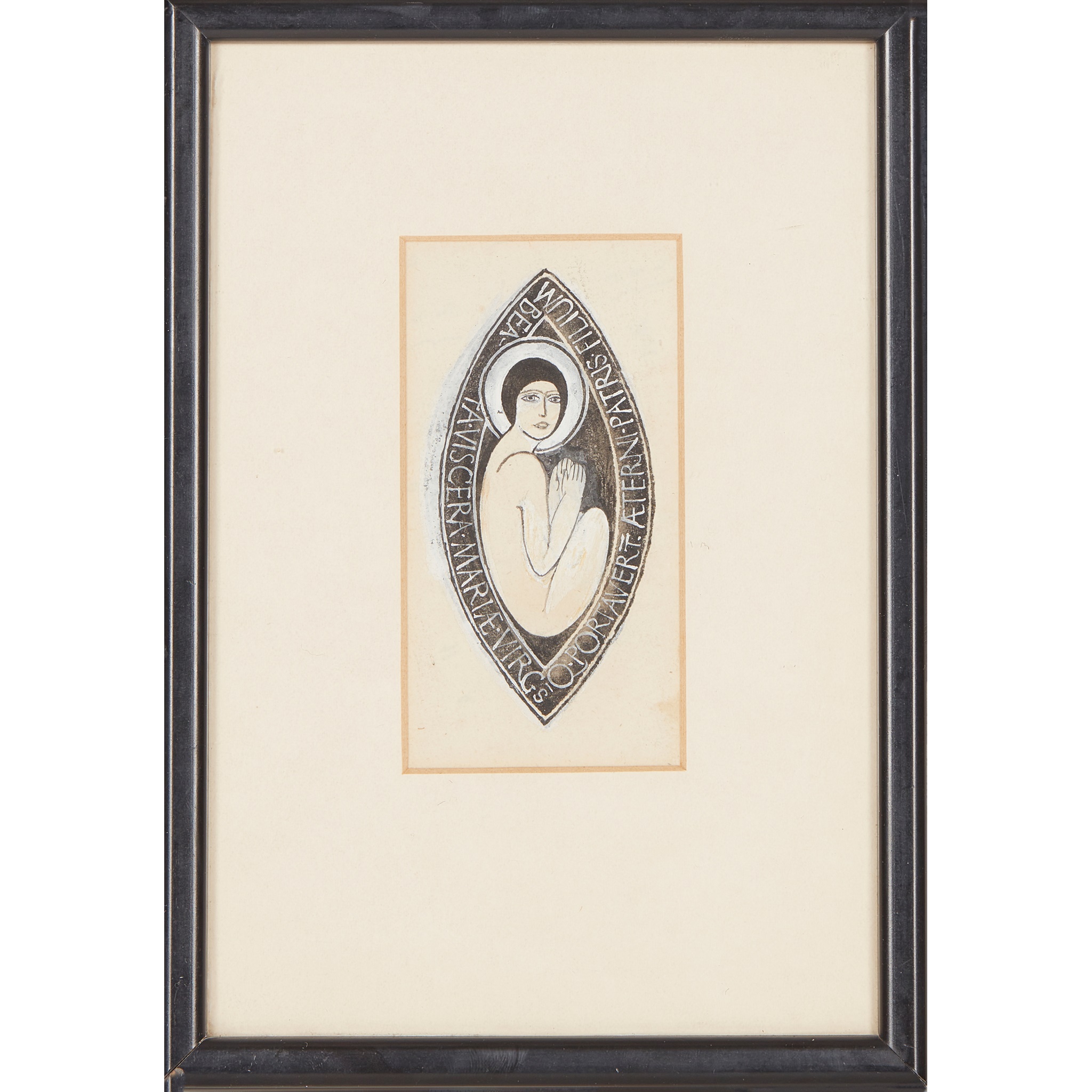 2. [Blessed Virgin Mary in vesica], mount aperture 10 x 5cm, text along border of vesica reading 'Beata viscera Mariae Virg[ini]s Q[uae] portaver[un]t aeterni Patris Filium' [not found in Skelton], printed label on backboard ('Original drawing by Eric Gill ...');