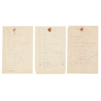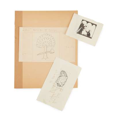Together with: ink sketch of a prisoner beesching an angel, unsigned but very likely by Gill, possibly depicting the Liberation of Saint Peter, traces of pencil, image size 5 x 5cm, sheet size 7.9 x 10.2cm; and a pencil list of sculptures on 3 sheets each with address in blind at head (11 New Square, Lincoln's Inn), in envelope with typescript label 'Eric Gill: MS. list of his sculptures. An important document in that it shows the stones which were his own work & some of the owners (Rothenstein, Rupert Brooke, Howard de Walden)')