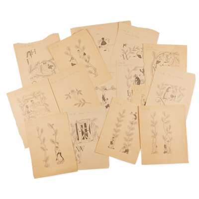 for the Golden Cockerel Press edition of The Canterbury Tales, 1929-31, all on irregularly cut or roughly torn-off strips of brown paper, with titles in pencil and numbers in ink to head, comprising: The Monk's Tale, headpiece [Skelton P600]; Crucifix with Man Kneeling, tailpiece to Melibeus [P599]; The Money Bag, tailpiece to The Monk's Tale [P602]; Christchild, tailpiece to the Prioress's Tale [P597]; The Prioress's Tale, headpiece [P588]; The Tale of Melibeus, headpiece [P593]; The Tale of Sir Topas, headpiece [P590]; The Nun's Priest's Tale, headpiece [P603]; Initials H and O with Venus Modestly Holding Spray, Cupid Playing Football with the World [P582]; and 4 historiated leaf-spray borders