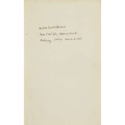 Cottage Economy by William Cobbet. With an Introduction by G. K. Chesterton. Hammersmith: published by Douglas Pepler at the Hampshire House Workshops, 1916. First edition, 8vo, original cloth-backed printed paper boards, wood-engraved diagram by Gill, inscribed by Eric Gill 'to Mrs. Louisa Bourne, from E & E Gill, Hopkins Crank, Ditchling, Sunday March 3, 1918' on front free endpaper, wood-engraved bookplate of one Basil Truscott Hargrave [Evan Gill 313: 'This is no. 3 of S. Dominic's Press publications'];