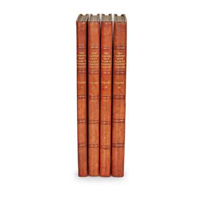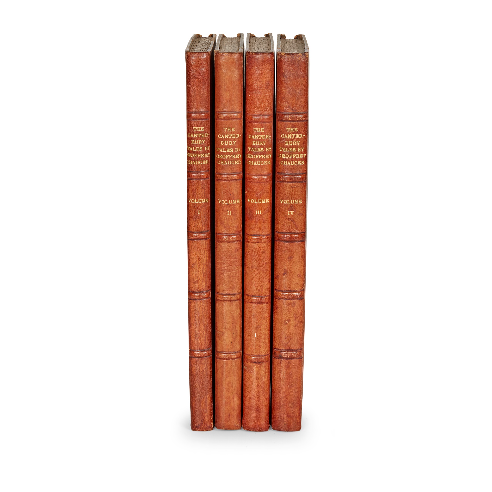 With Wood Engravings by Eric Gill. Waltham Saint Lawrence: Golden Cockerel Press, 1929-31. First edition, one of 485 copies on hand-made paper, 4 volumes, folio, original orange quarter niger by Sangorski & Sutcliffe, patterned paper sides, top edges gilt, others untrimmed, decorative borders throughout comprising figures entwined in leaf sprays, occasionally extending into line-fillings, 21 half-page vignettes, one full-page illustration, tailpieces, initials printed in red, black and blue, bookplates (T. Birkett), corners bumped and worn [Evan Gill 281]