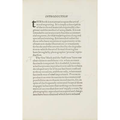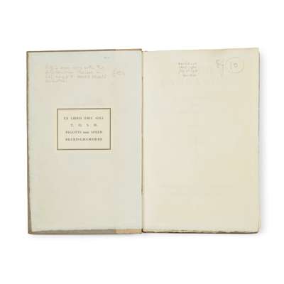 Eric Gill's personal working copy of the second edition, inscribed by him 'Eric Gill sd, capel-y-ffin, July 23rd 1925, from H.P.' on the front free endpaper, with his pencilled revisions to the introduction and verso of the title-page, proof sheets for the introduction laid in, his pencilled monogram (followed by an encircled figure '10') to the front free endpaper and dust jacket, and his Pigotts bookplate to the front pastedown. 'H. P.' is presumably H. C. D. Pepler. The first edition appeared in 1920 and contained five wood-engravings by Gill, increased to ten for this edition.