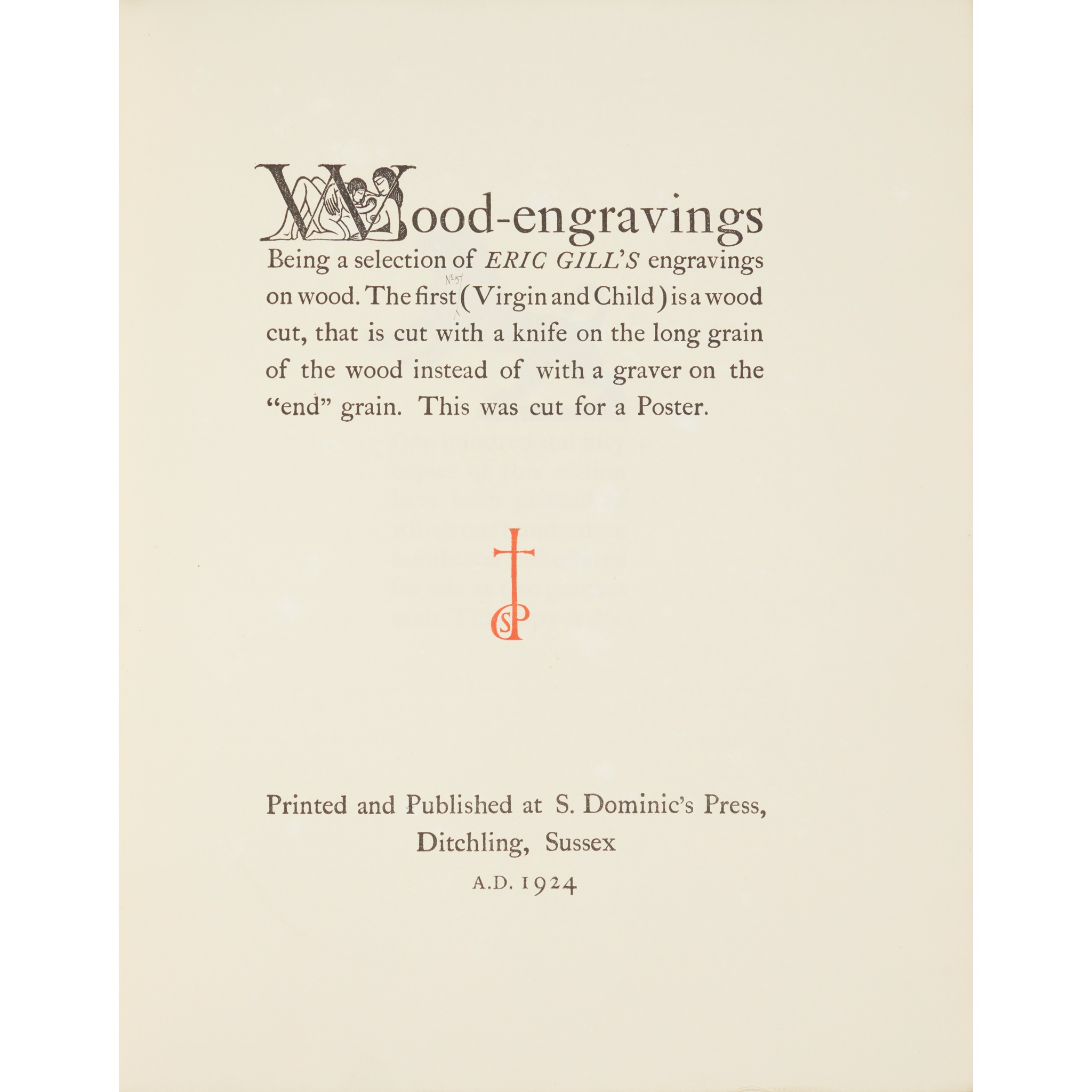 Ditchling: S. Dominic's Press, 1924. First edition, number 75 of 100 copies 'numbered and offered for sale at two guineas each' (from the total edition of 150), 4to, original cream buckram, dust jacket (lettered 'Wood-Engravings E. G.' on front panel), half-title, title-page with wood-engraved figurative initial, publisher's device printed in red, and manuscript annotation ('No 5'), 32 wood-engravings each on separate page, light browning, dust jacket with a few chips and damp-stains [Evan Gill 410]