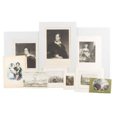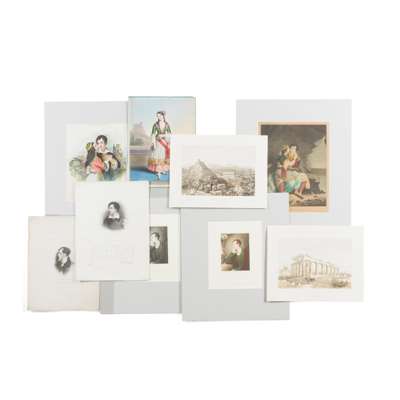 17 19th century engravings of Greece; 3 Byron related lithographed plates; one small 19th century pencil copy of a Byron portrait, 9 x 11cm