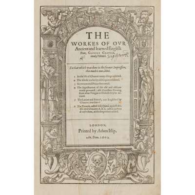 Note: An attractive copy of Adam Islip's edition of Chaucer's workes. At the head of the title is the price 1: 1: 0, which is probably the price of the work prior to the binding.