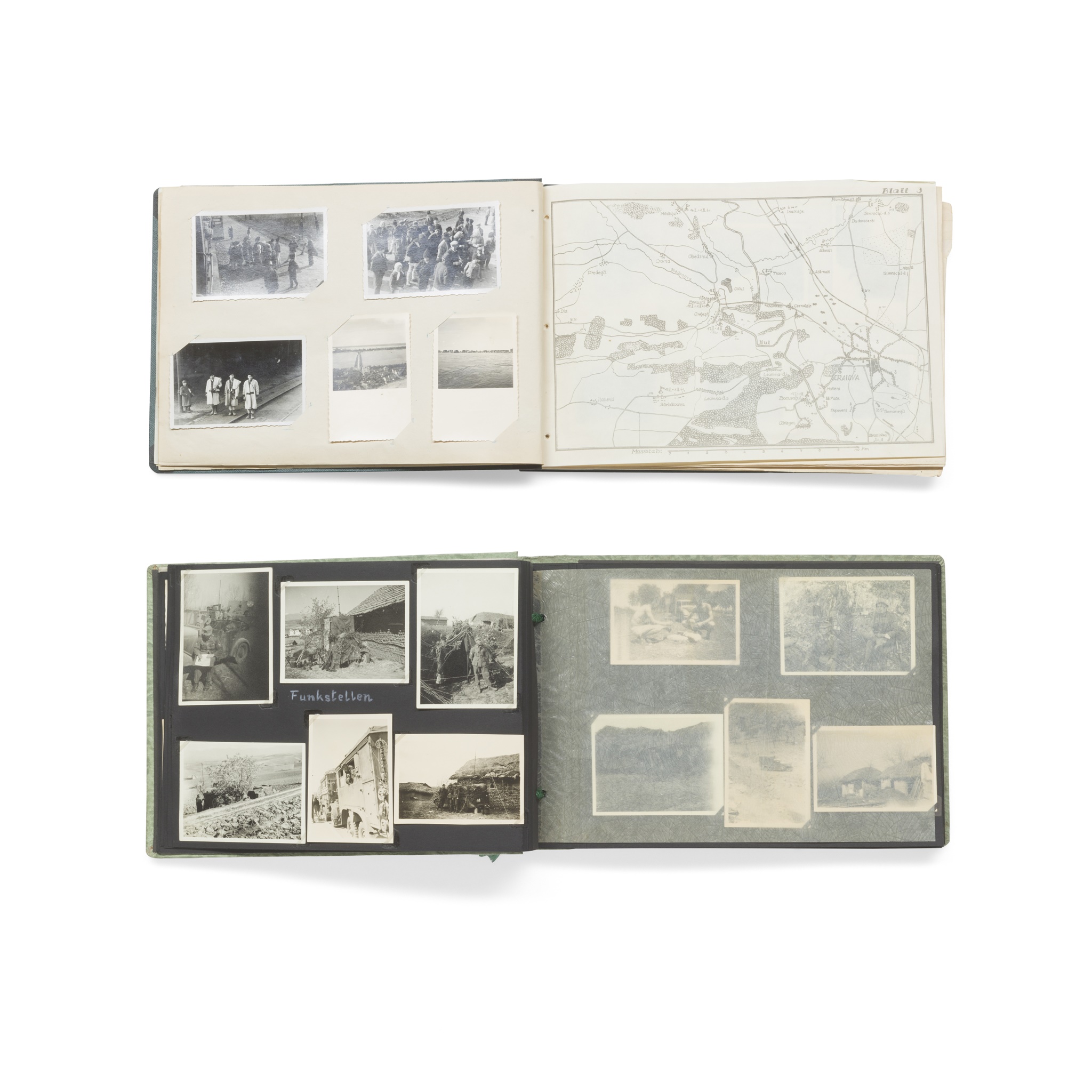 Das Pionier Bataillon 70 in Griechenland. Zeit vom 11.2.1941 bis 20.6.1941. Gezeichnet von ObGefr. Musll und Gefr. Ihlemann. 131 personal photographs of the Batallion in Greece, various sizes, mostly small, bound with German military maps of Greece, with 7 photographs loosely inserted, oblong 4to green cloth folder;