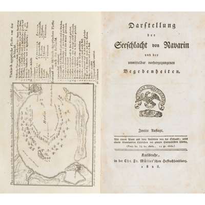 Darstellung ber Seeschlacht von Navarin under der unmittelbar vorhergegangenen Begebenheiten. Karlsruhe: C. F. Mueller, 1828. Second edition, 8vo, [43pp.], engraved plan frontispiece and 3 folding lithographed plates, red library stamp on verso of title of ?Queen Frederika, ?contemporary boards made from a map of SE Europe