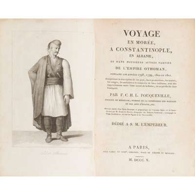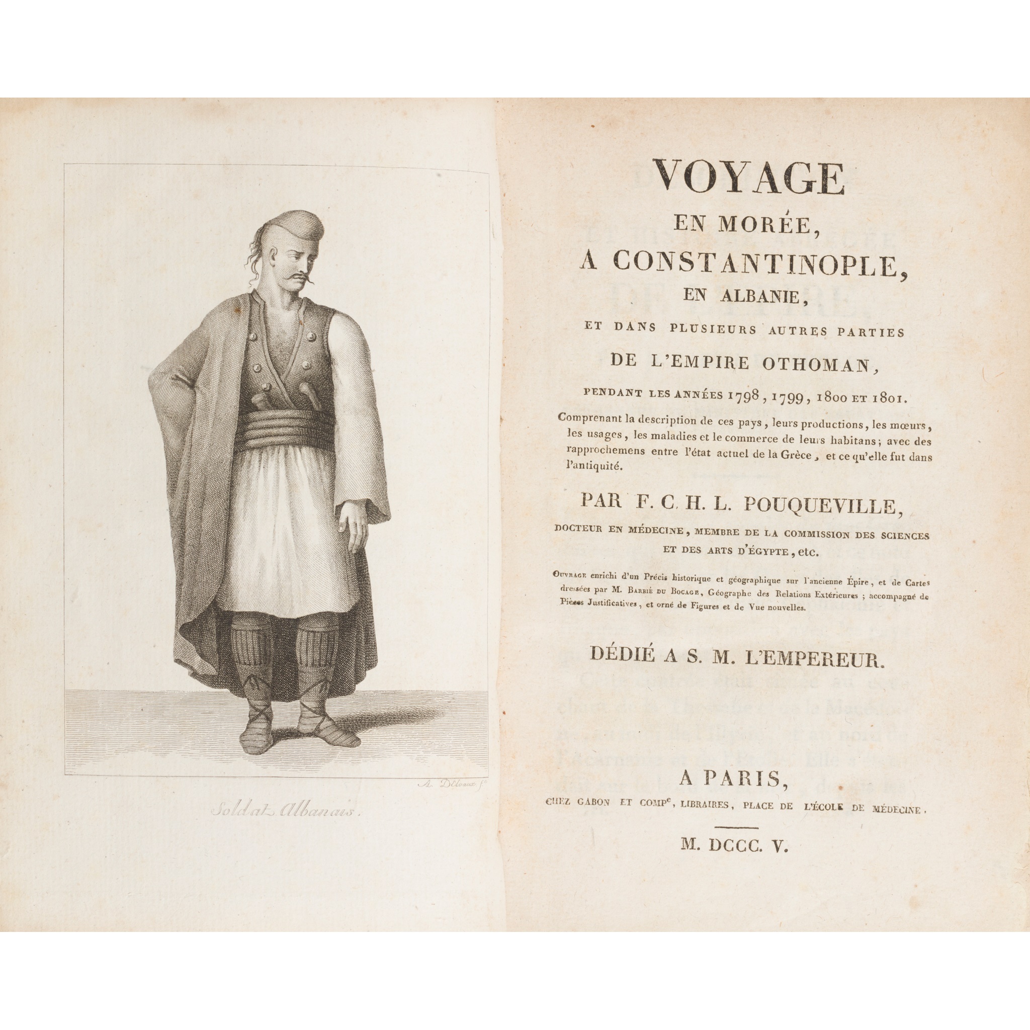 et dans plusieurs autres parties de l'empire Othoman. Paris: Gabon & Co., 1805. First edition, 3 volumes, 8vo, 2 engraved frontispieces, 2 folding maps, 1 folding plate and 1 folding letterpress title, contemporary half calf, half-titles, volume 1 title supplied in photocopy, a little browning, chiefly to margins, slight dampstaining to some upper margins, mostly in volume 2, slightly rubbed, bookplate of the Chateau de Rosny "La Solitude"