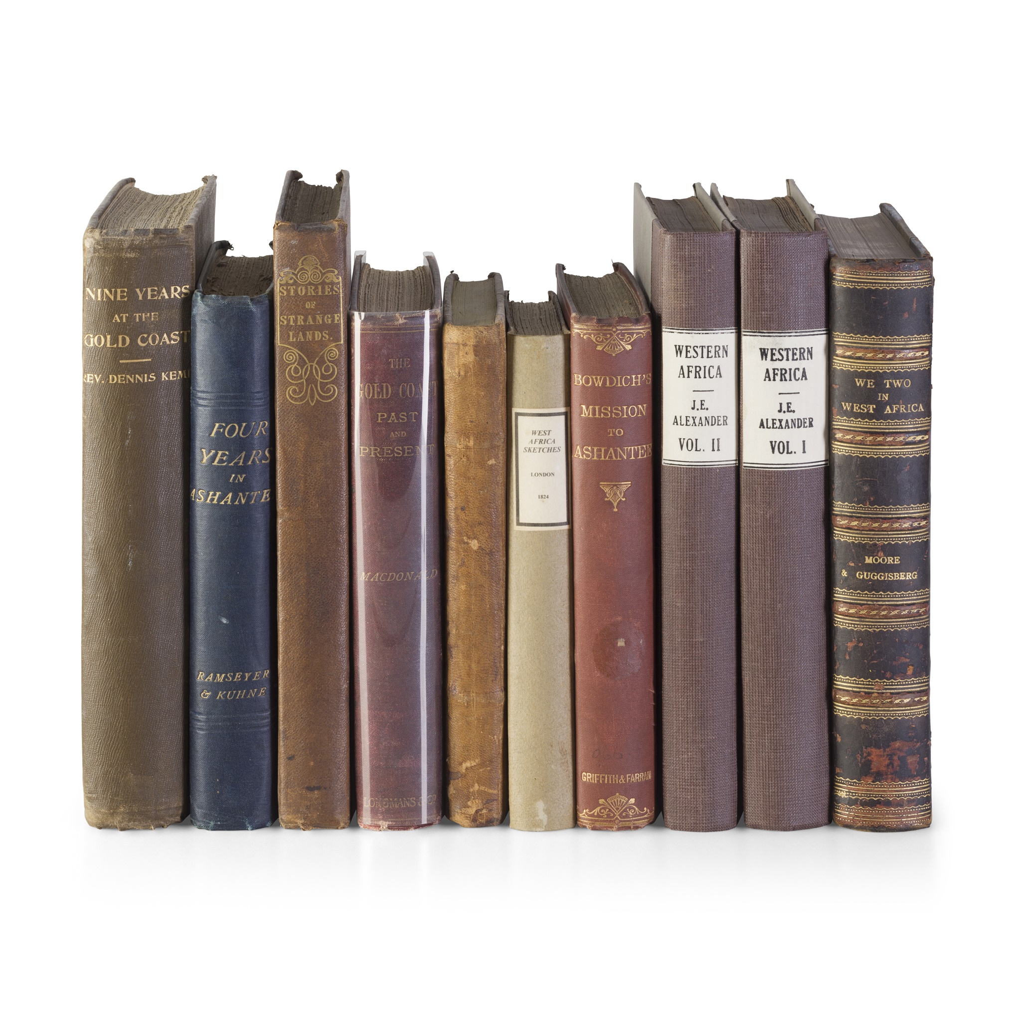 Bowdich, T. Edward. Mission from Cape Coast Castle to Ashantee. 1873. 8vo, folding map, original brown cloth gilt, library stamps to title; Ramseyer and Kuhne. Four Years in Ashantee. 1878. Second edition, 8vo, plates, original cloth;