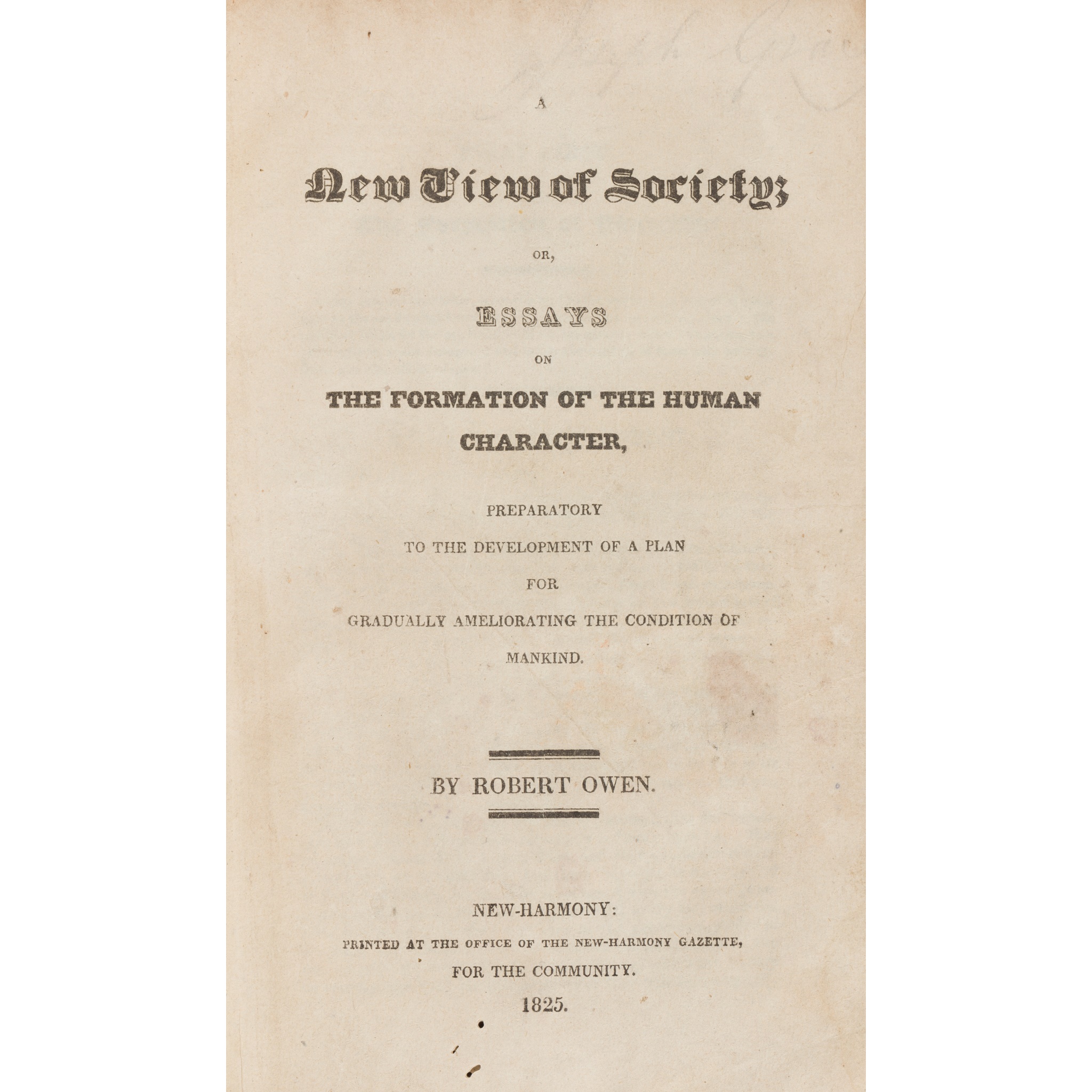 or Essays on the Formation of the Human Character. New-Harmony: printed at the office of the New-Harmony Gazette, for the Community, 1825. ?First American edition, 8vo, 115pp., contemporary half calf, slightly wormed in lower margin, occasionally extending into text at end, rebacked, some dampstaining, tiny hole to last leaf affecting one word