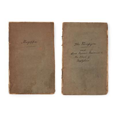 Note: The work was first published earlier the same year by Henry Colburn, who sold the sheets to Sherwood in response to the controversy surrounding the false attribution of the work to Lord Byron. Sherwood's first issue retained the attribution on the half-title and title-page. For this second issue both leaves were reset, but the rest of the text was unchanged. Byron himself publicly disavowed the work, publishing his 'Fragment' of his own vampire story as an addendum to his poem Mazeppa, a copy of which is included with the lot (Mazeppa, A Poem, London: John Murray, 1819, first edition, 8vo, original wrappers, half-title, 72 pp., 8 pp. advertisements, ownership inscription 'H. Senhouse', damp-staining, spine cracked, held by one cord only).