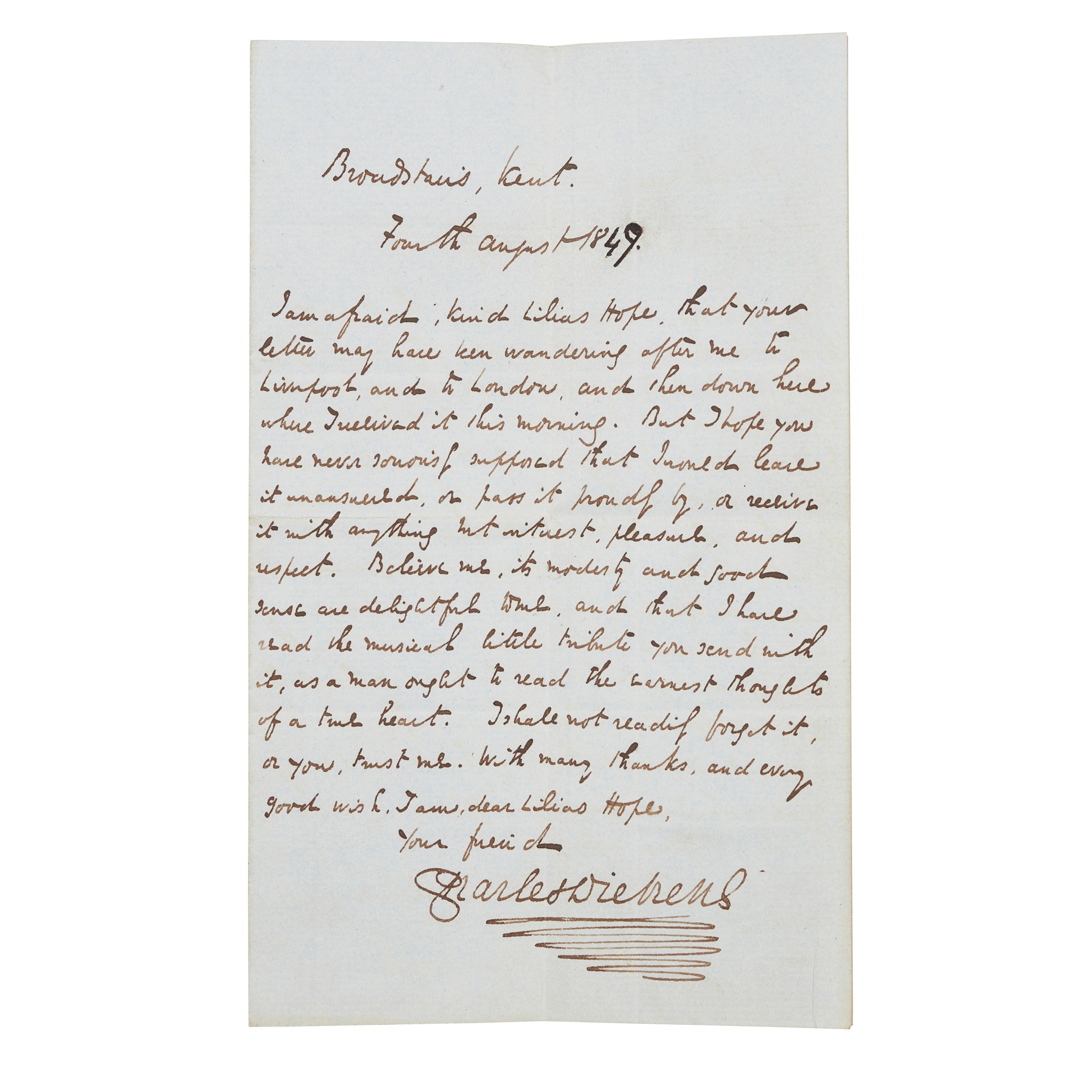 single bifolium of blue laid paper (18.2 x 11.2cm), written on one side only, in brown ink, addressed to 'Kind Lilias Hope', thanking her for her letter and 'the musical little tribute you send with it', signed 'Charles Dickens' with his characteristic flourished underline