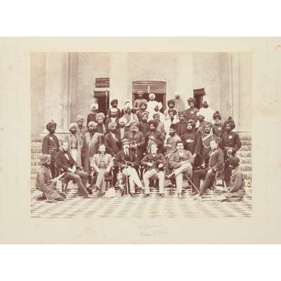 [Group portrait of British officers and local notables], 20 x 27cm (one figure indicated with caption 'Mr Jenkins, killed at Cabul');